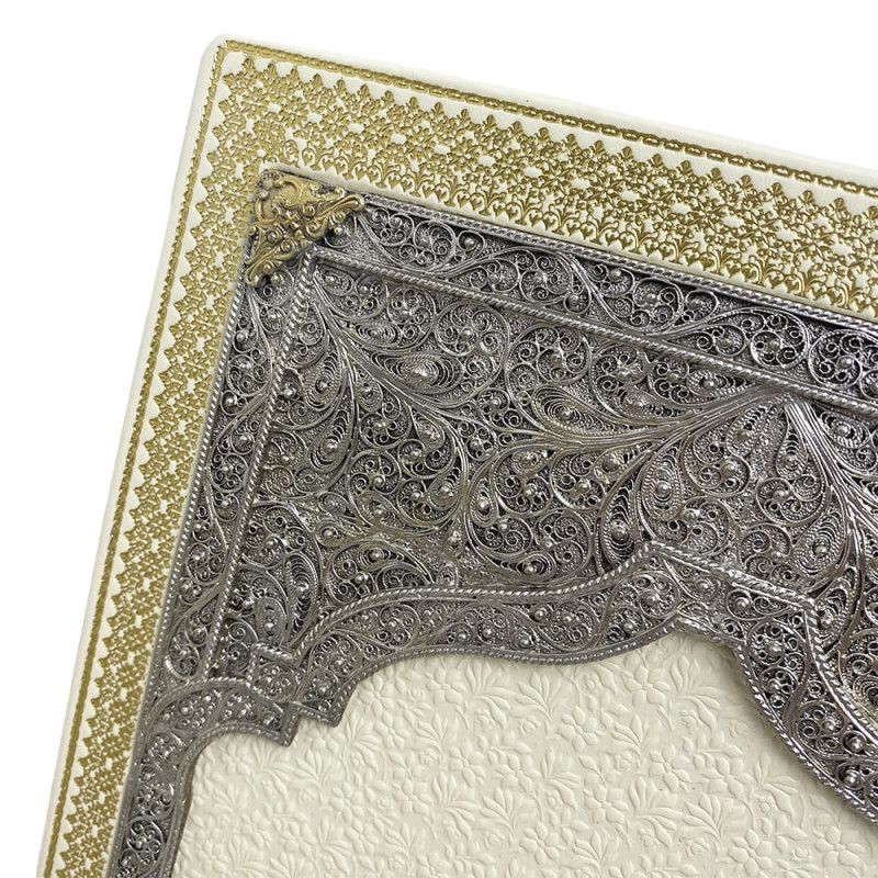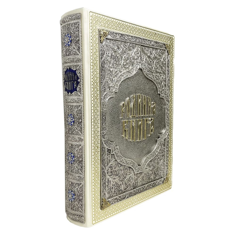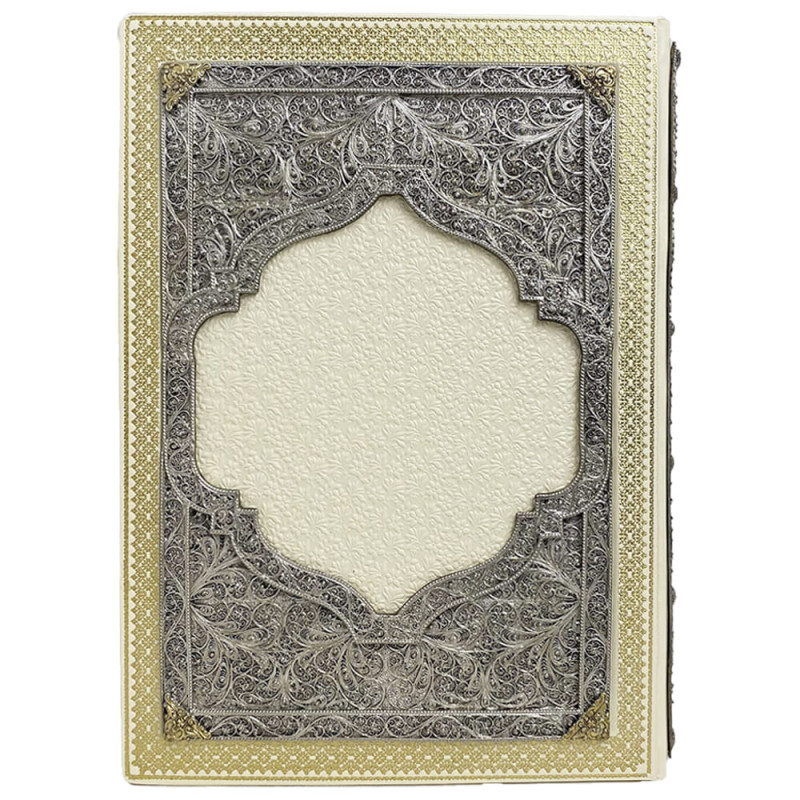 Данная подарочная книга оформлена в переплет из натуральной высококачественной кожи ручной работы. Вся книга украшена красивыми медными накладками, которые покрыты серебром и золотом, а также, по всему периметру, книга украшена золотым тиснением. На книге имеются декорации художественной ювелирной эмалью и качественные стразы. С боковой части книги есть цветной срез.