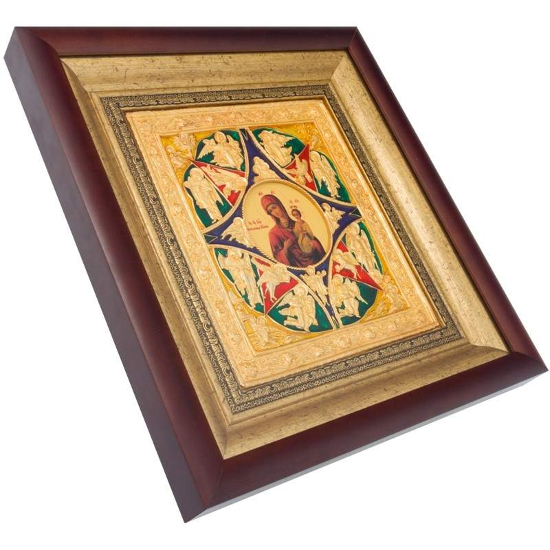 Прекрасная икона изготовлена мастером методом литья. Икона обложена в медный оклад, который сверху покрыт позолотой. Украшена икона художественной ювелирной эмалью. Икона оформлена в багет и защищена плотным стеклом.