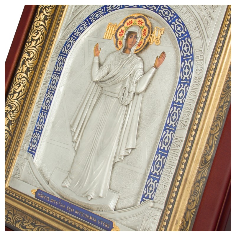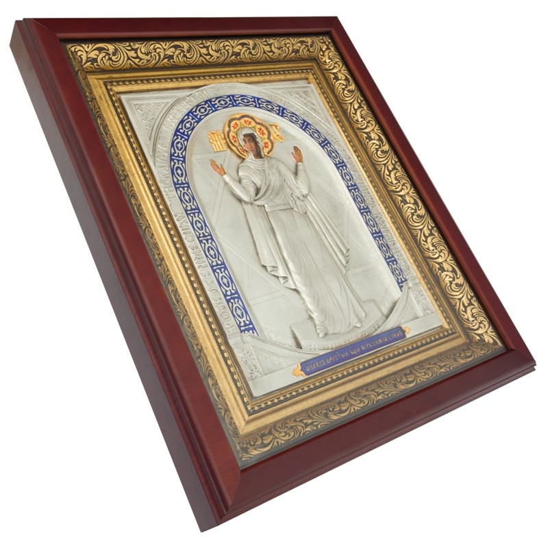 Прекрасная икона изготовлена мастером методом литья. Икона обложена в медный оклад, который сверху покрыт серебром и позолотой. Украшена икона художественной ювелирной эмалью и патиной. Икона оформлена в багет и защищена плотным стеклом.