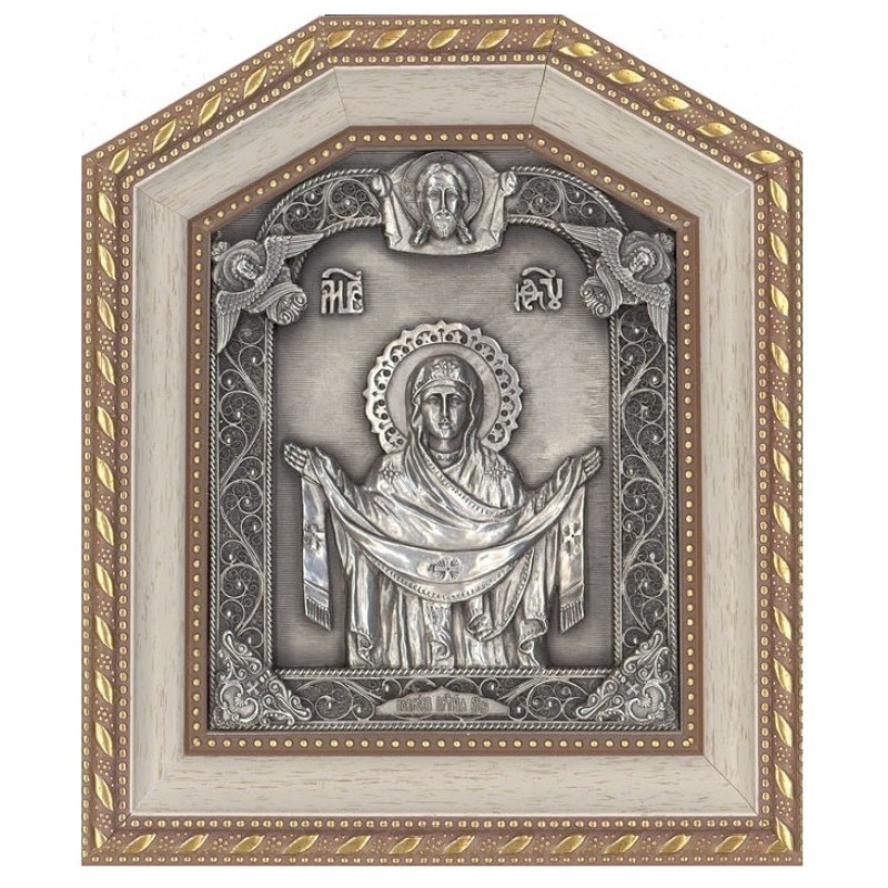 Прекрасная икона изготовлена мастером методом литья. Икона обложена в медный оклад, который сверху покрыт серебром, украшена патиной. Икона оформлена в декоративный багет.