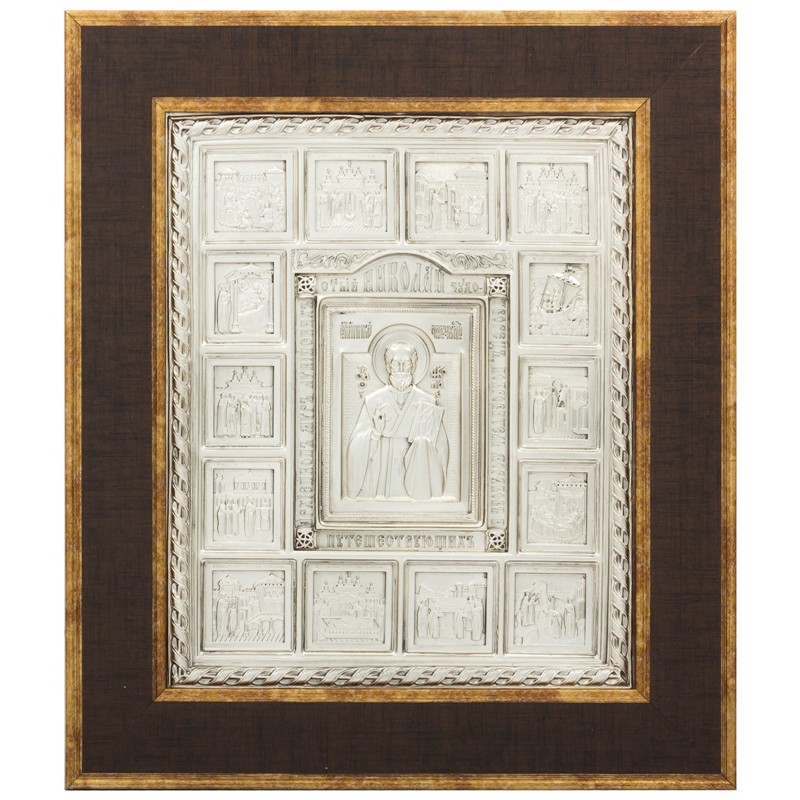 Прекрасная икона изготовлена мастером методом литья. Икона обложена в медный оклад, который сверху покрыт серебром, украшена патиной. Икона оформлена в декоративный багет, стилизованный под дерево.