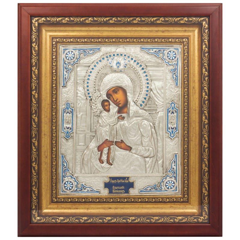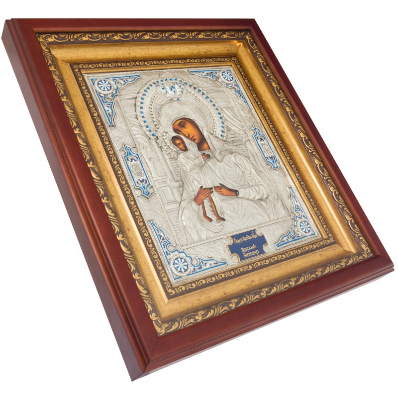 Прекрасная икона изготовлена мастером методом литья. Икона обложена в медный оклад, который сверху покрытом серебром. Украшена икона художественной ювелирной эмалью, патиной и декорирована вставками кристаллов. Икона оформлена в багет и защищена плотным стеклом.