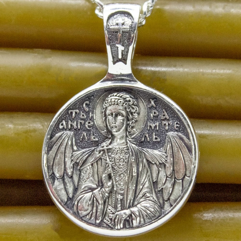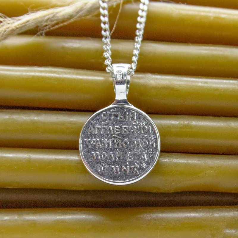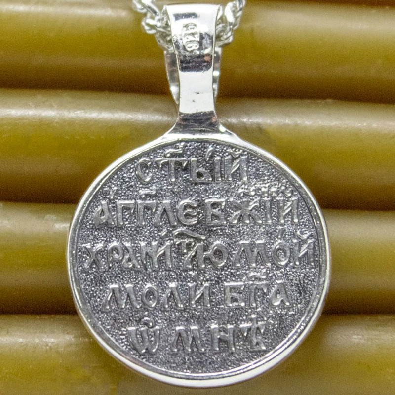 На лицевой стороне ладанки изображение Ангела Хранителя. На обороте слова с молитвы "Святой Ангел Божий, хранитель мой, моли Бога обо мне".