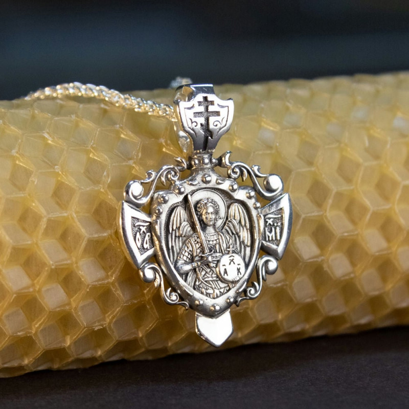 На лицевой стороне подвески изображение Архангела Михаила, на обратной стороне слова из молитвы "Святой Архистратиг Божий Михаил, моли Бога за нас".