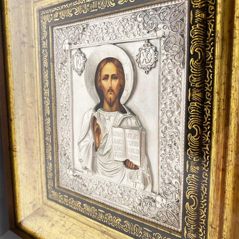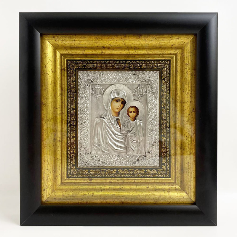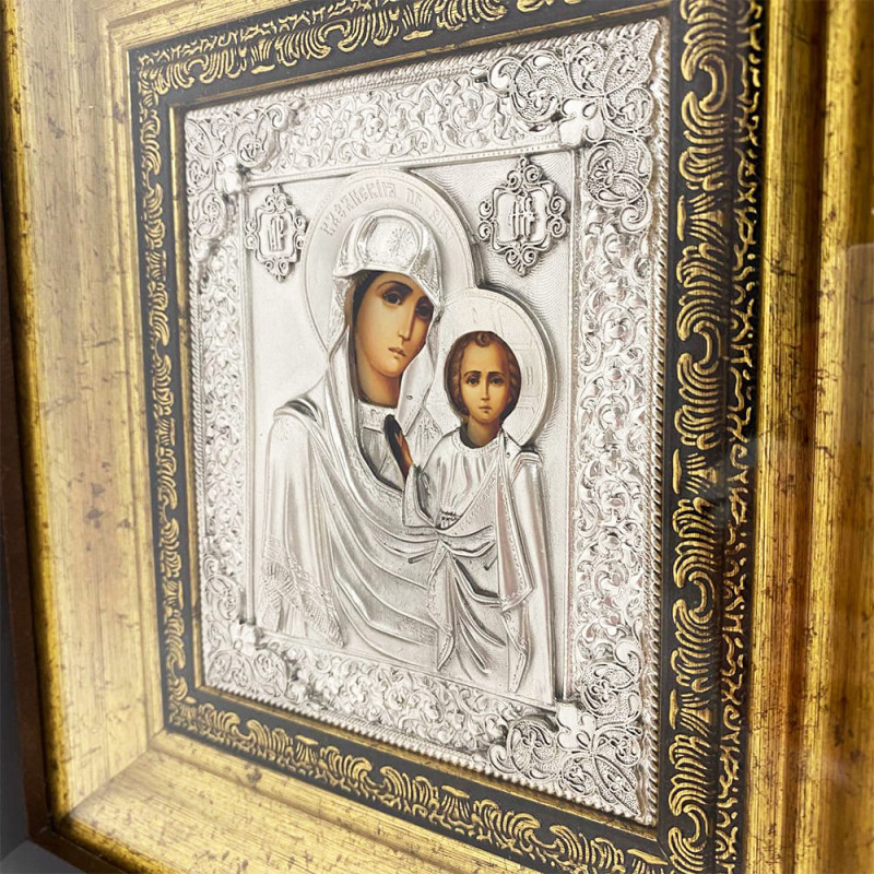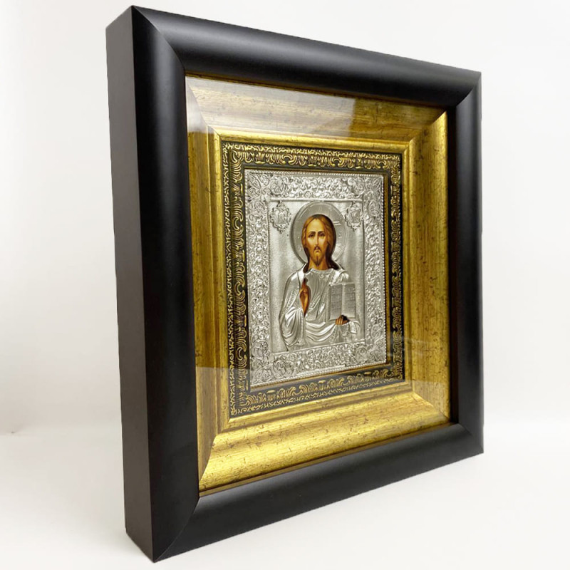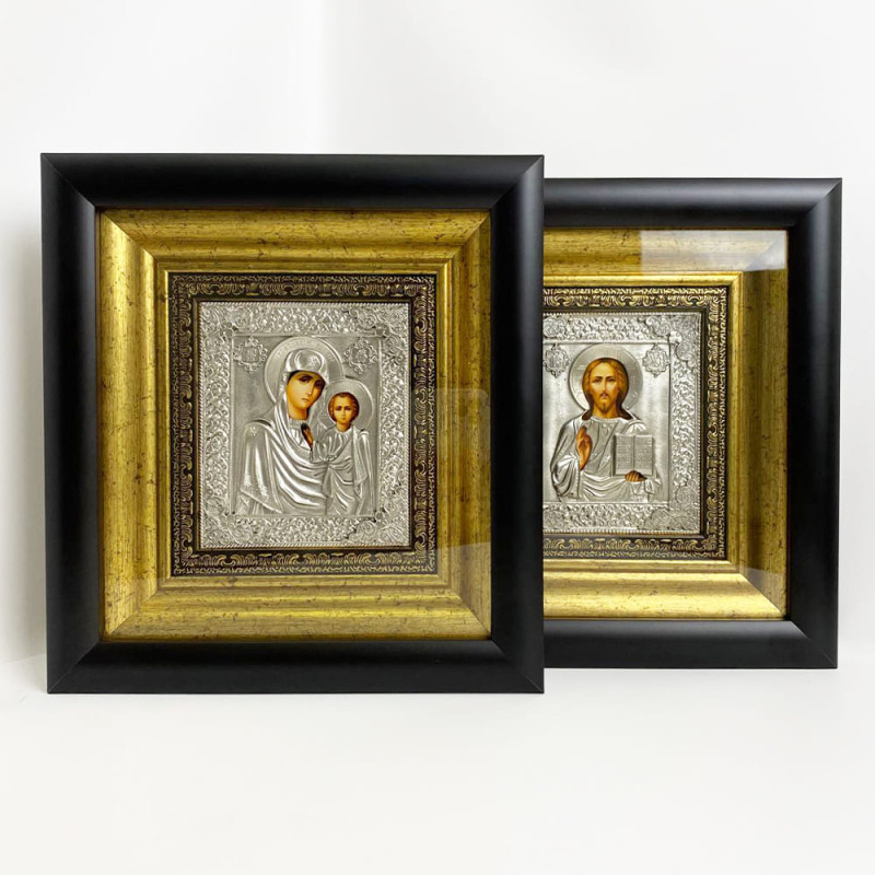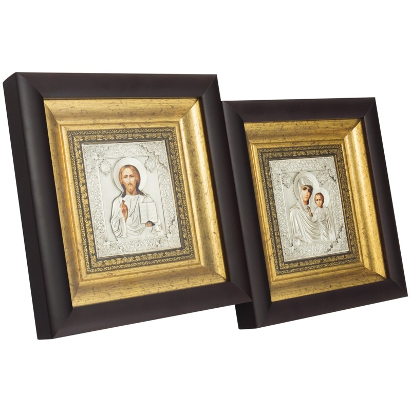 Прекрасная венчальная пара икон изготовлена мастером методом литья. Иконы обложены в медный оклад, который сверху покрыт серебром, украшены патиной. Иконы оформлены в багет и защищены плотным стеклом.
