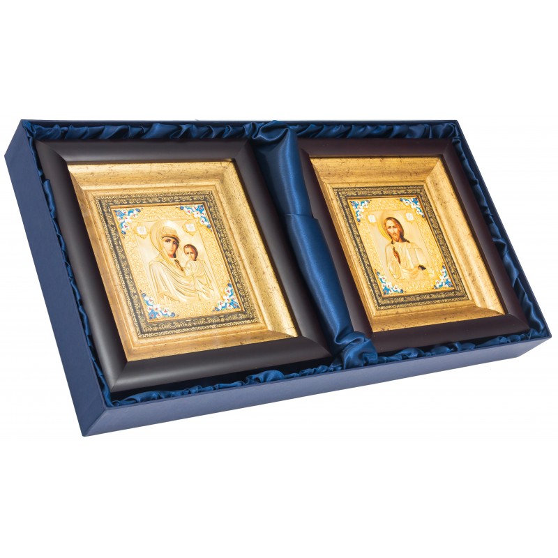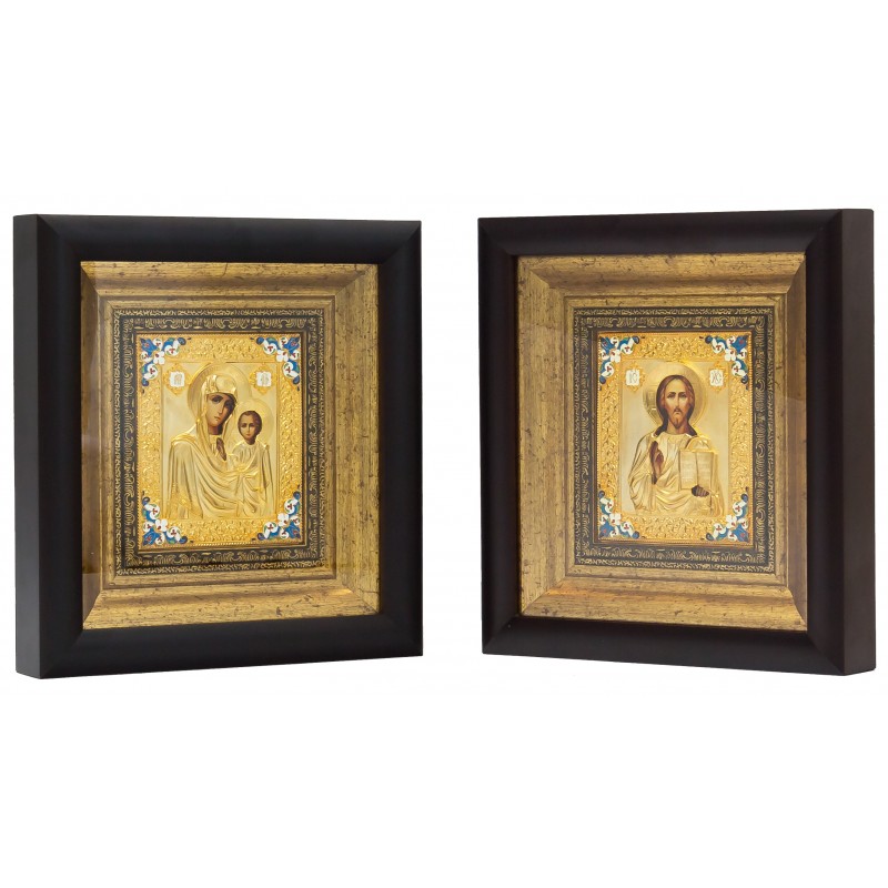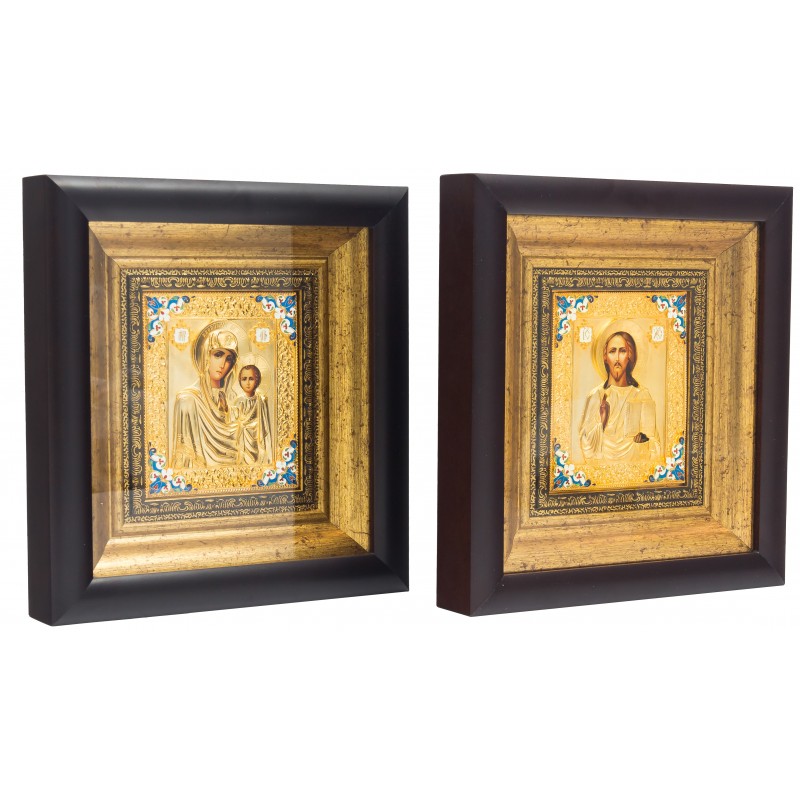 Прекрасная венчальная пара икон изготовлена мастером методом литья. Иконы обложены в медный оклад, который сверху покрыт позолотой, украшены художественной ювелирной эмалью. Иконы оформлены в багет и защищены плотным стеклом.