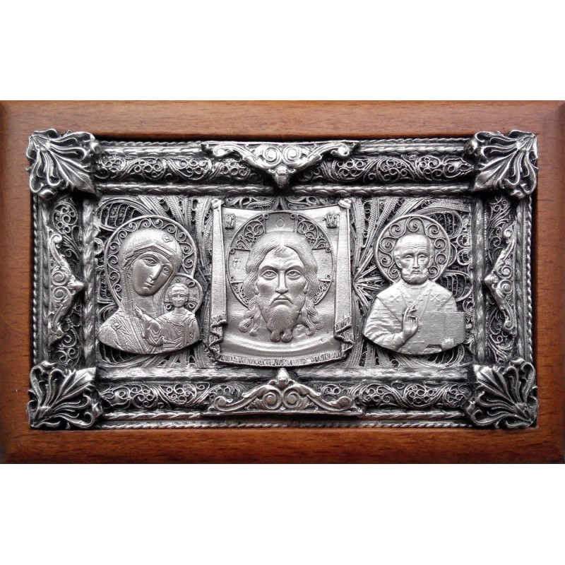Серебряная автомобильная икона триптих в деревяной рамке