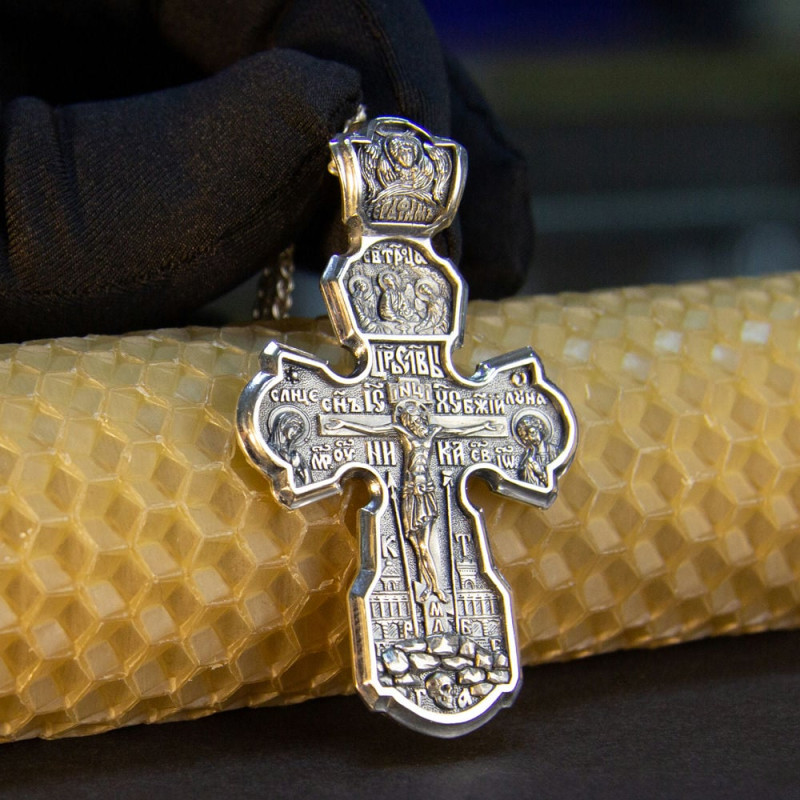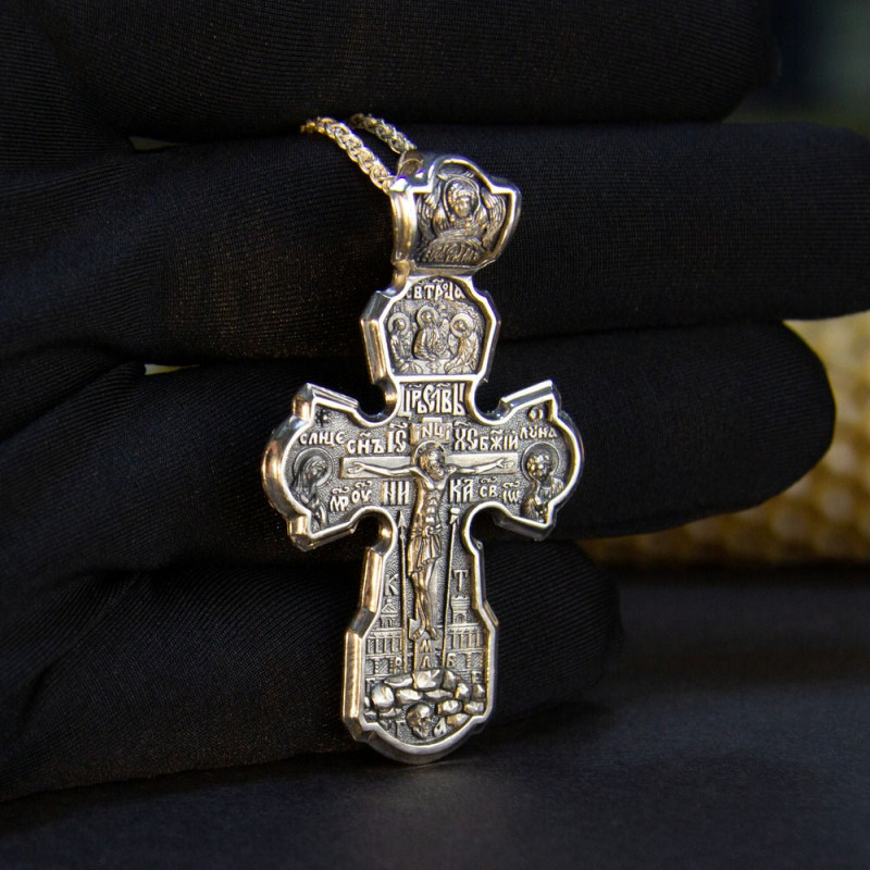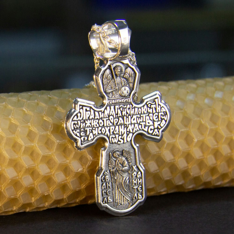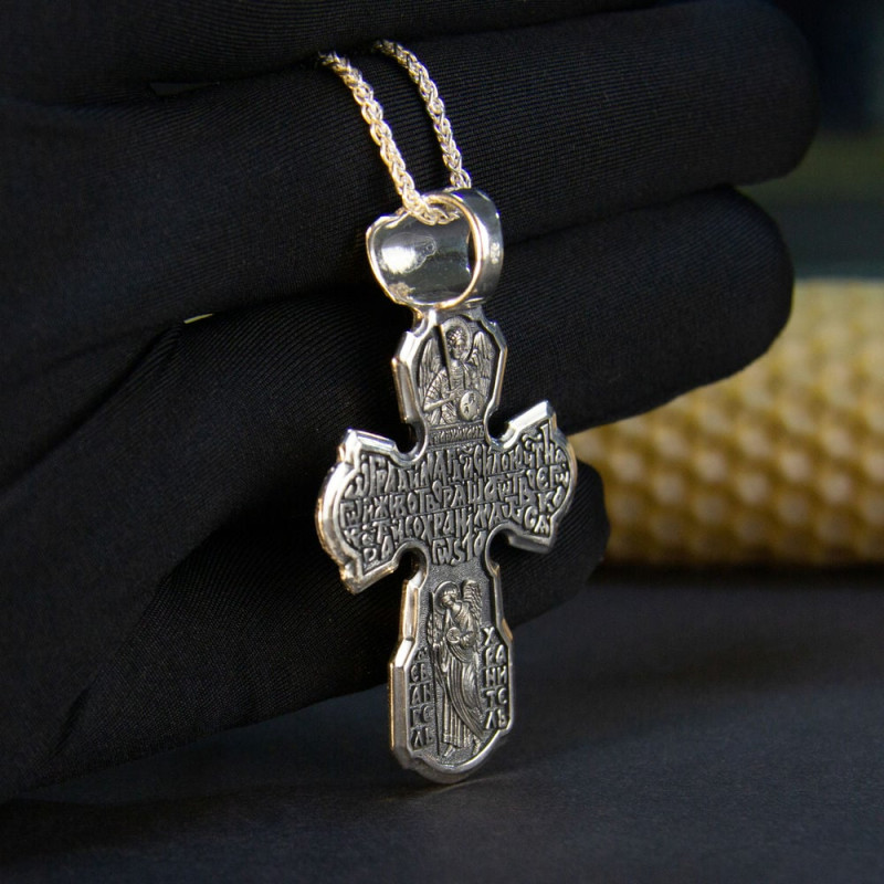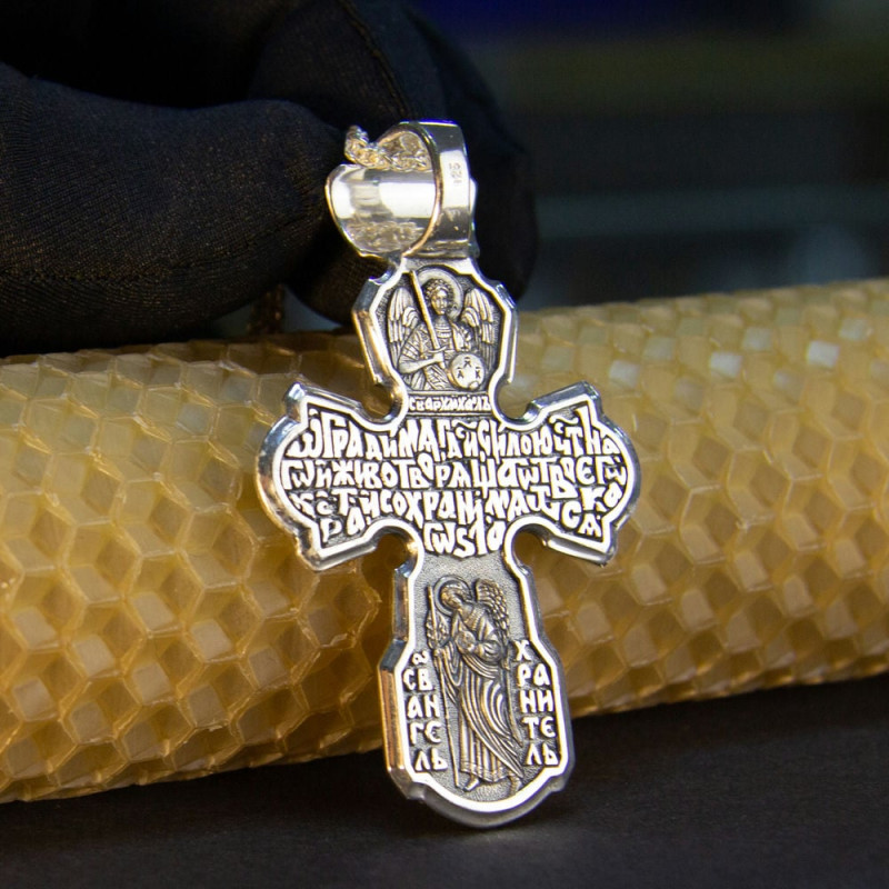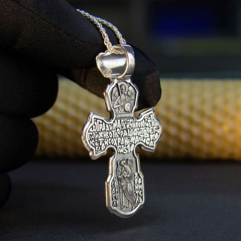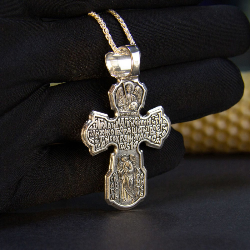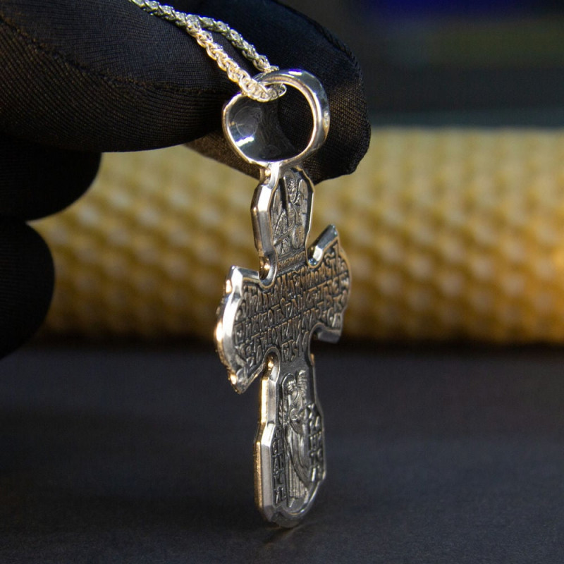 На лицевой стороне крестика изображение Спасителя Иисуса Христа и Святой Троицы. На обратной стороне изображен со словами из молитвы.