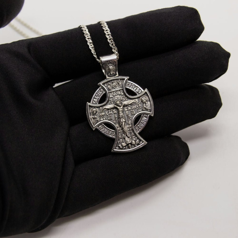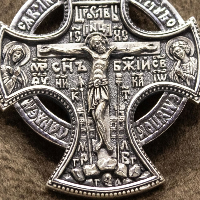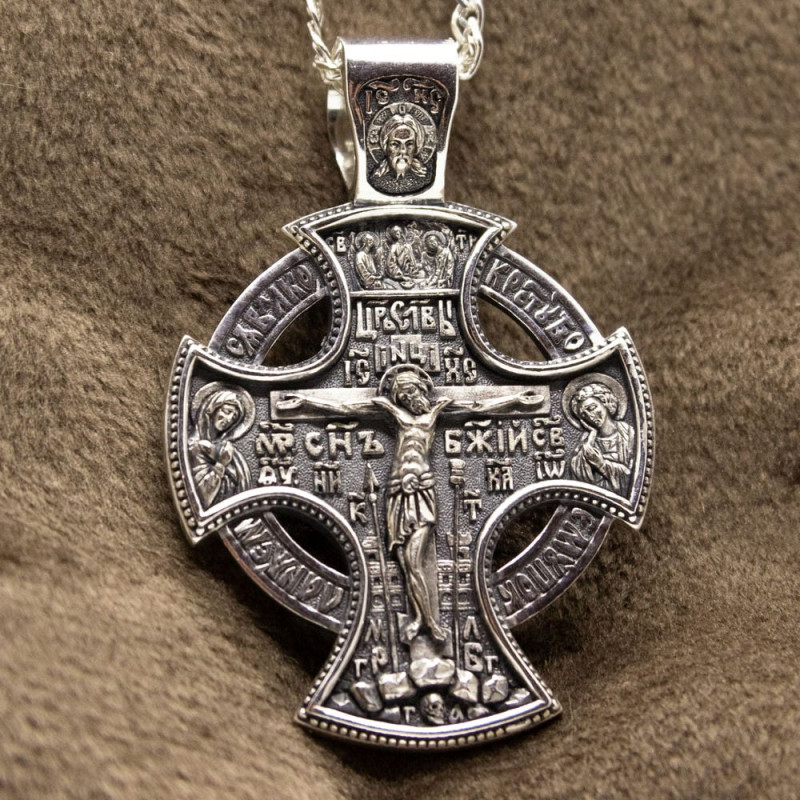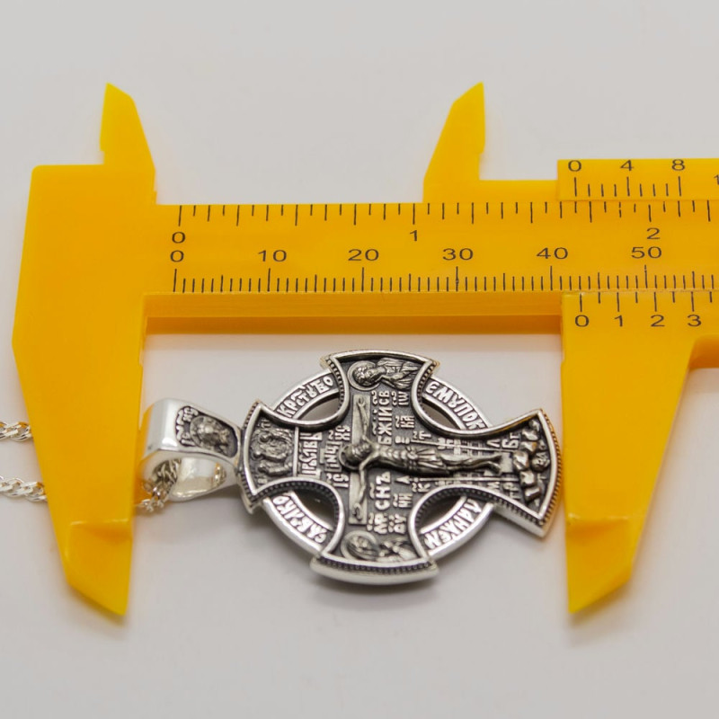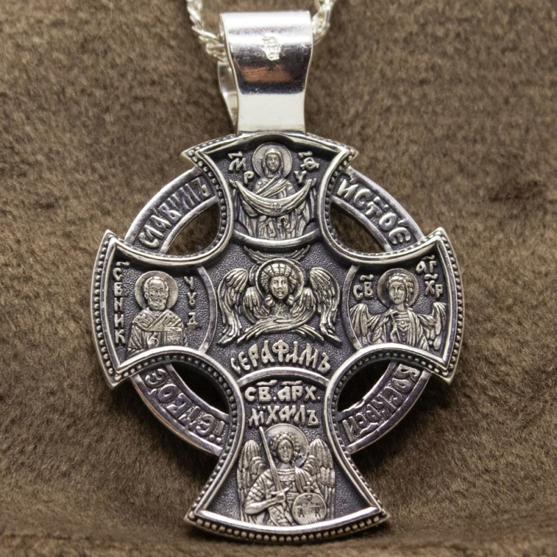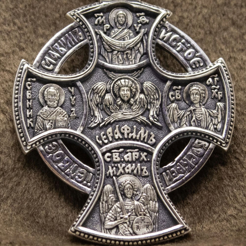 На лицевой стороне крестика изображение Спасителя Иисуса Христа и Святых. На обороте изображен Святой Серафим, Пресвятая Богородица, Архангел Михаил со словами молитвы.