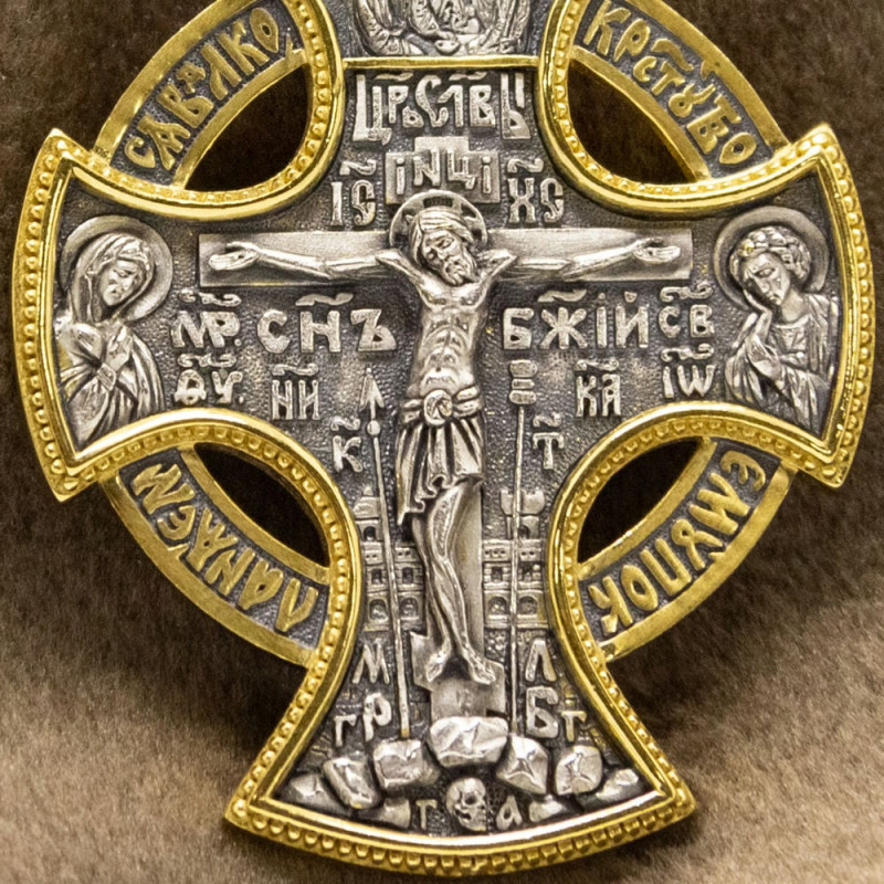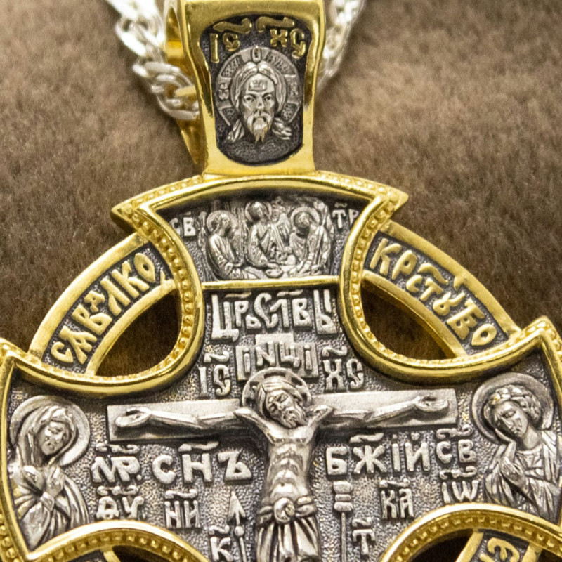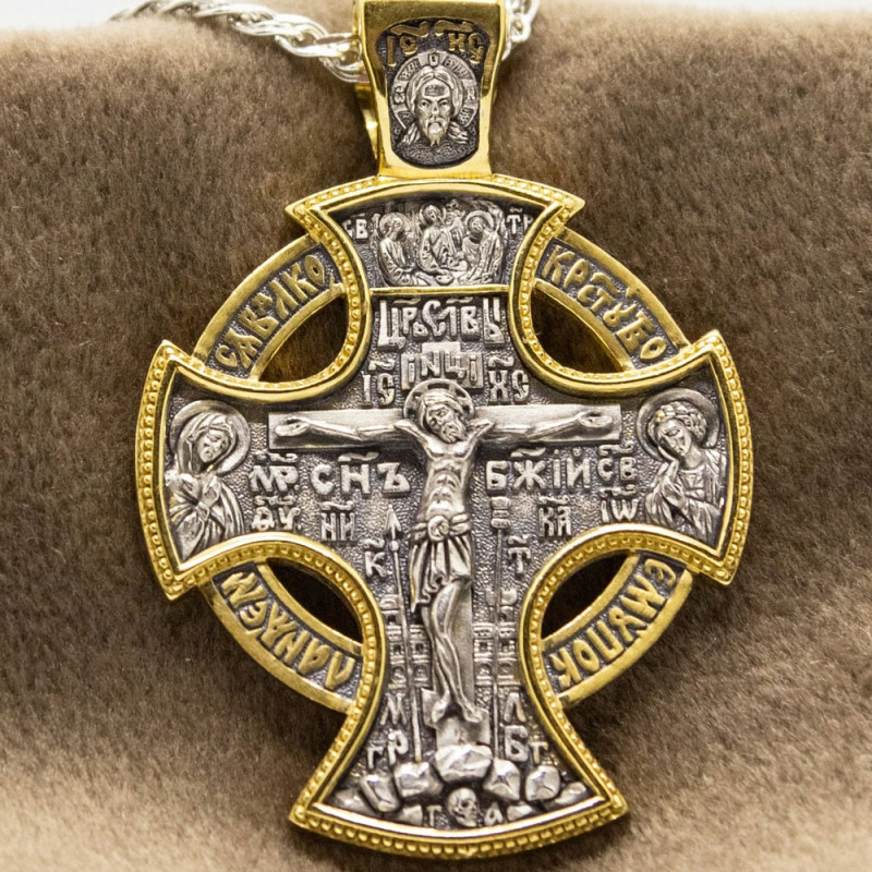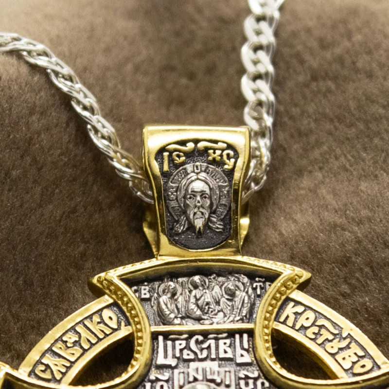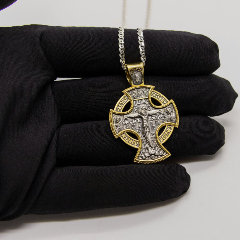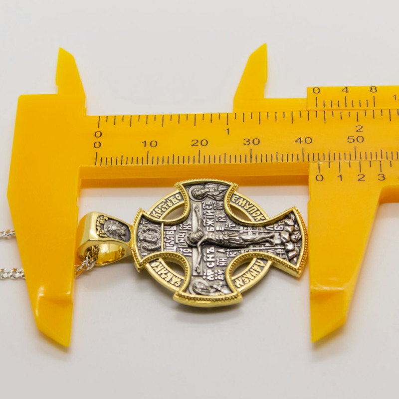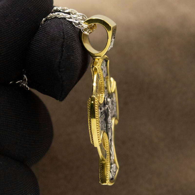 Серебряный крестик изготовленный из серебра 925 пробы и покрыт позолотой 999 пробы.