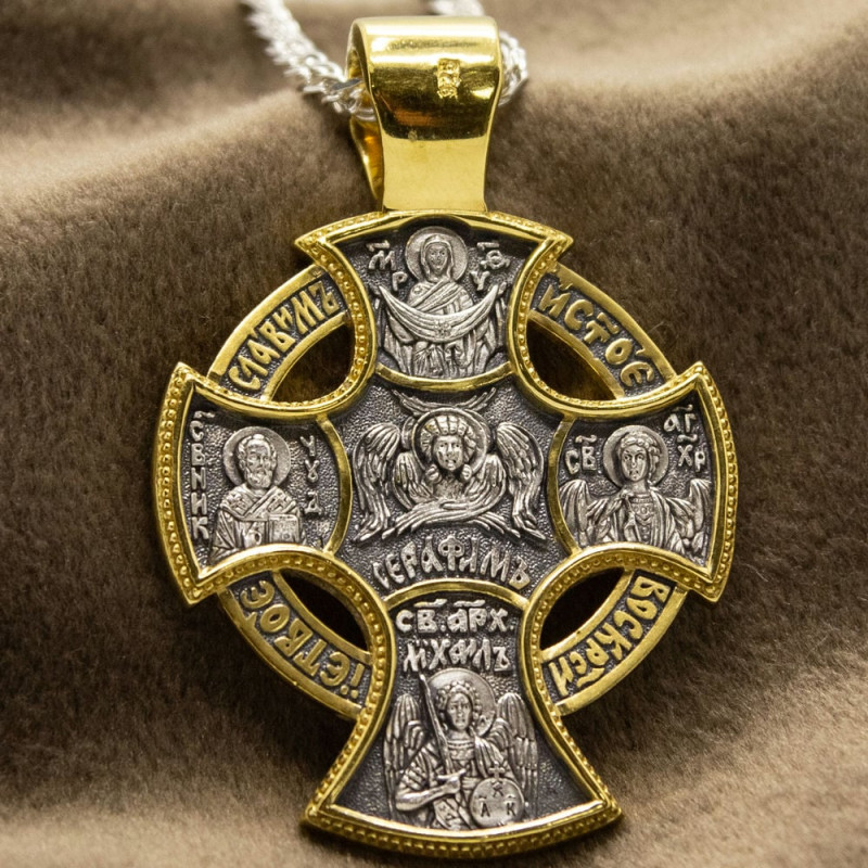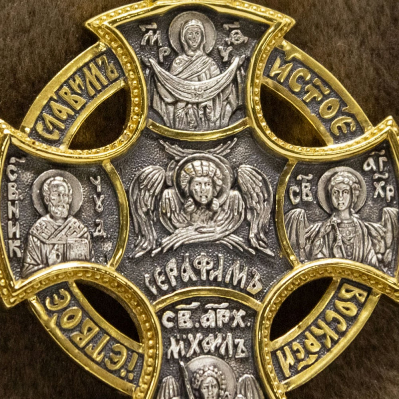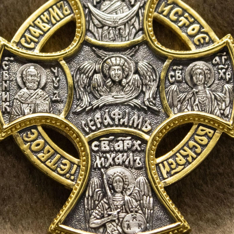 На лицевой стороне крестика изображение Спасителя Иисуса Христа и Святых. На обороте изображен Святой Серафим, Пресвятая Богородица, Архангел Михаил со словами молитвы.