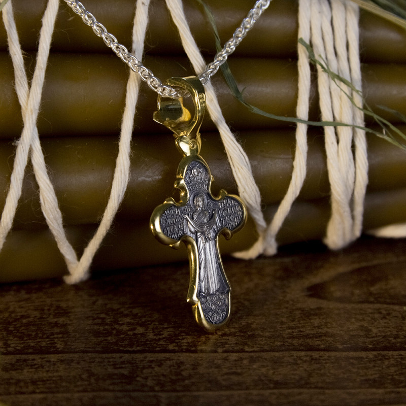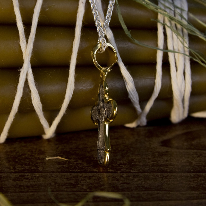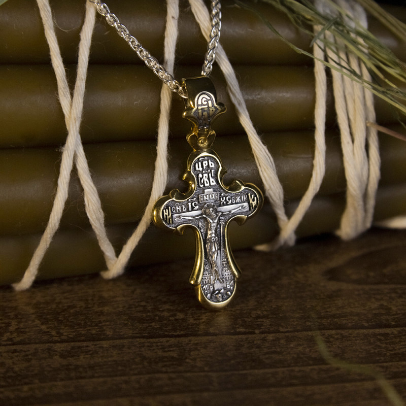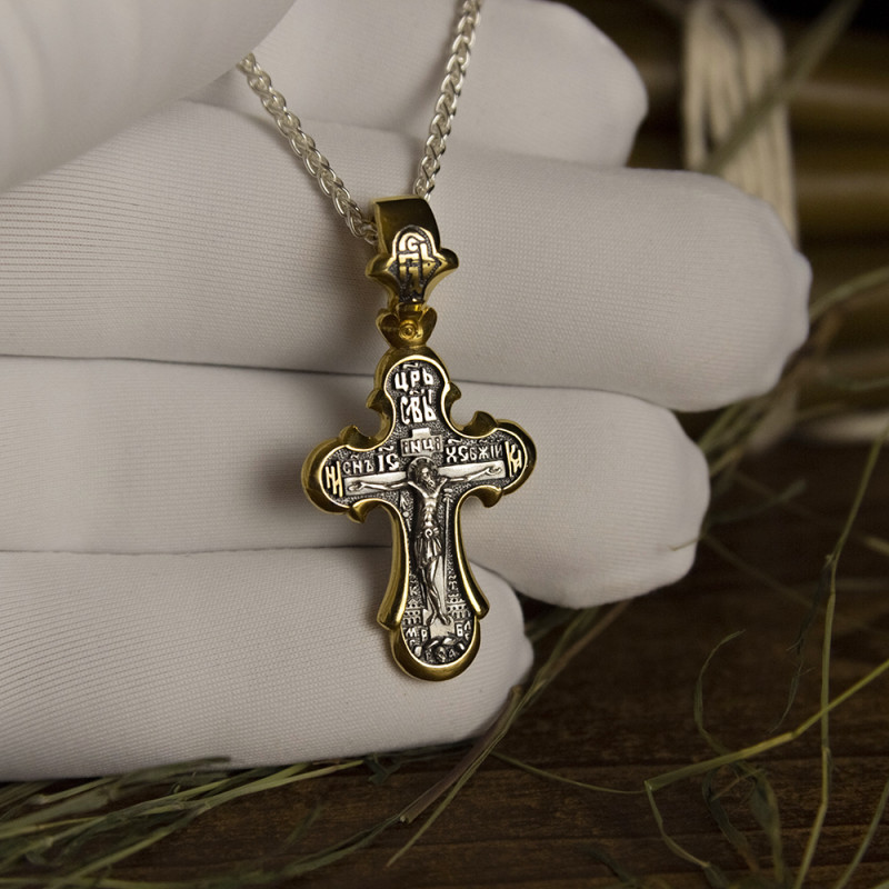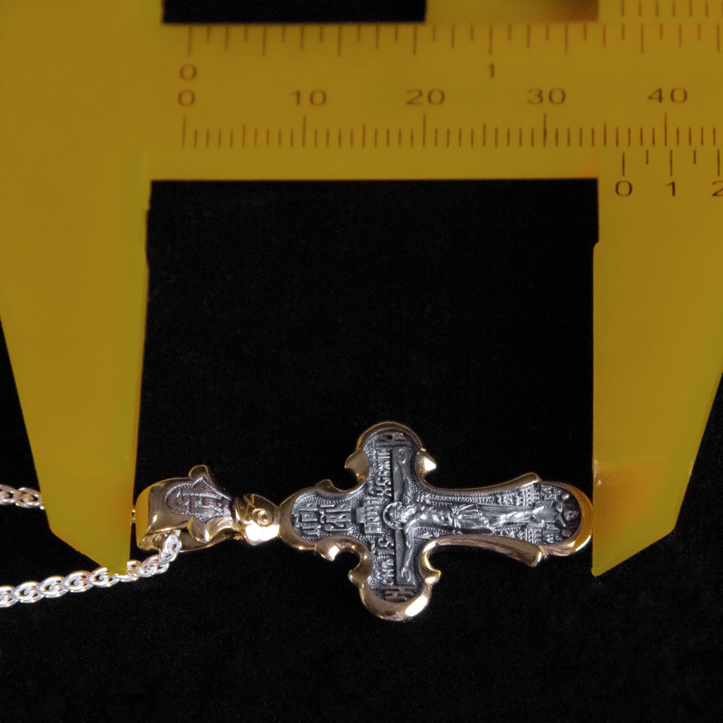 Серебряный крестик изготовленный из серебра 925 пробы и покрыт позолотой 999 пробы.