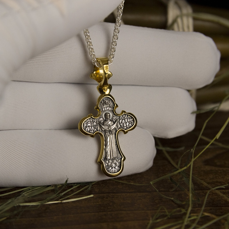 На лицевой стороне крестика изображение Спасителя Иисуса Христа. На обратной стороне изображена Богородица и Серафим со словами из молитвы "Мати божия, сохрани меня под кровом твоим".