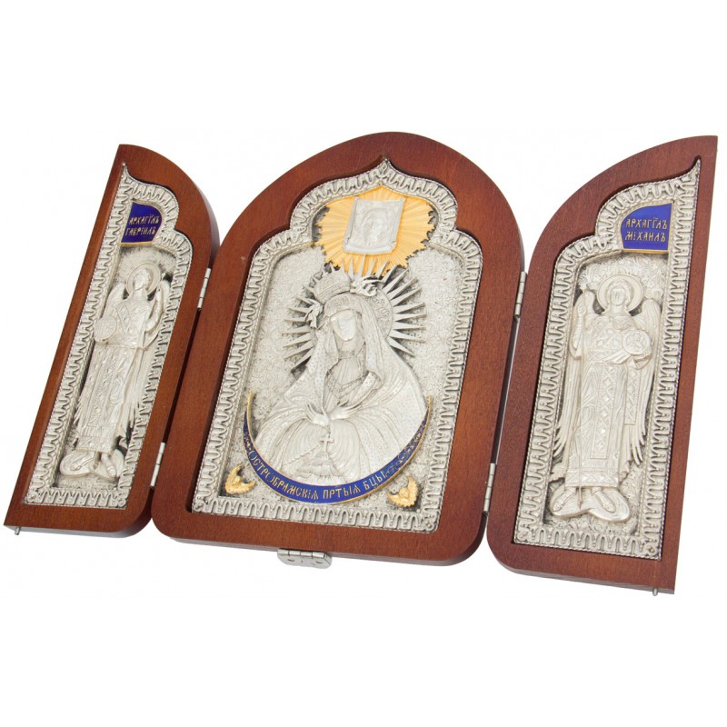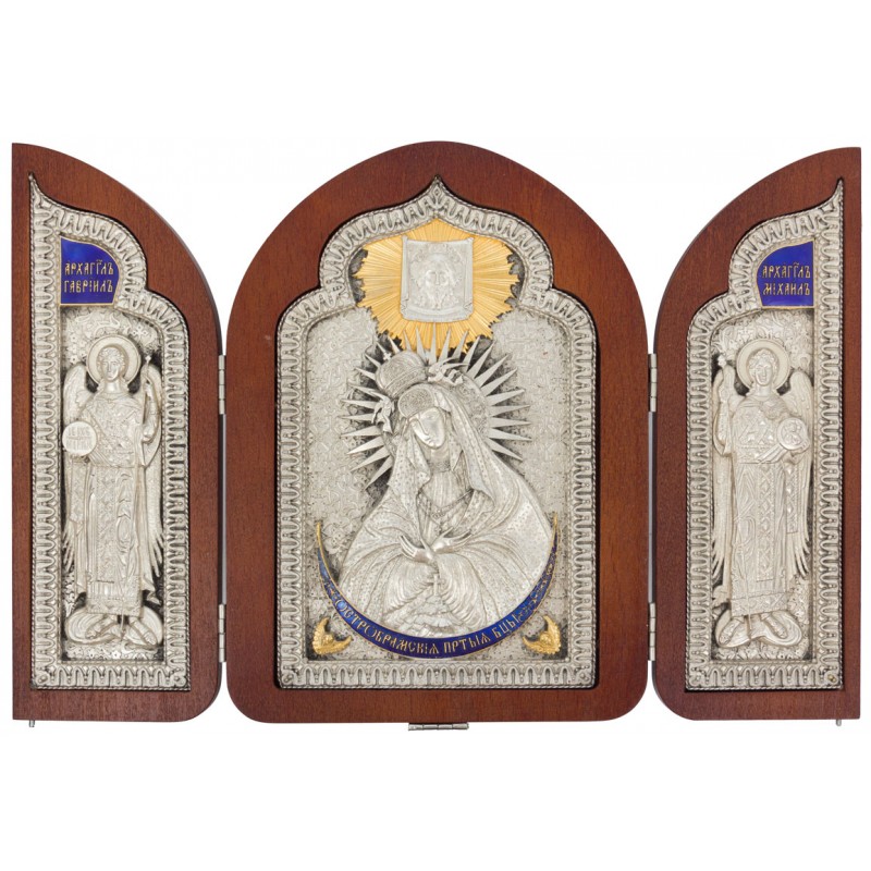 Складень состоит из трех икон: Богородица "Остробрамская", "Архангел Михаил" и "Архангел Гавриил". Прекрасный настольный складень изготовлен мастером методом литья. Иконы обложены в медный оклад, который сверху покрыт серебром и позолотой, украшен художественной ювелирной эмалью и патиной. Иконы оформлены в багет.