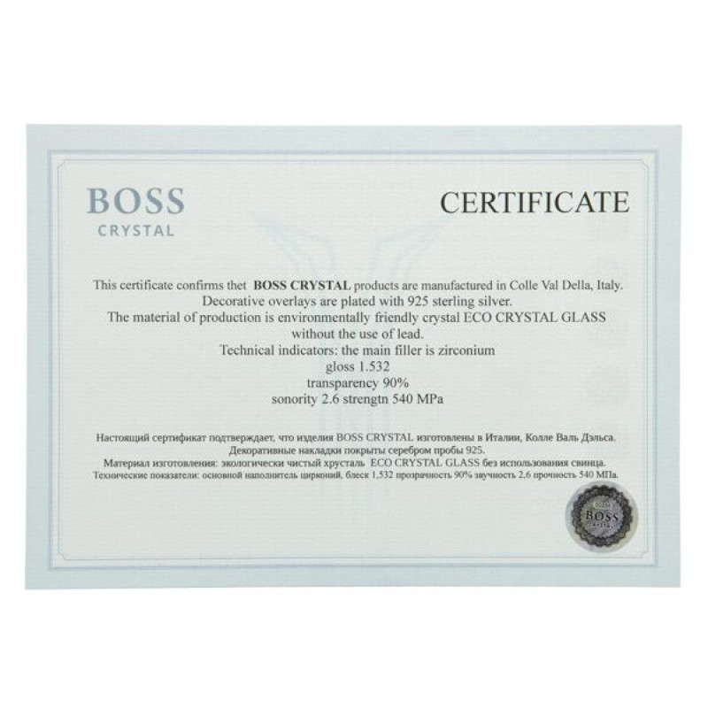 Набор для виски BOSS CRYSTAL представляет собой эксклюзивную разработку итальянских мастеров специально для компании PRESENTA. Набор изготовлен из хрусталя вручную и декорирован накладками, покрытыми серебром пробы 925 и золотом 24Kt. Накладки выполнены по уникальному дизайну лимитированному тиражу. Эскизы животных нарисованы в 2019 году украинским художником Василием Рукавишниковым.