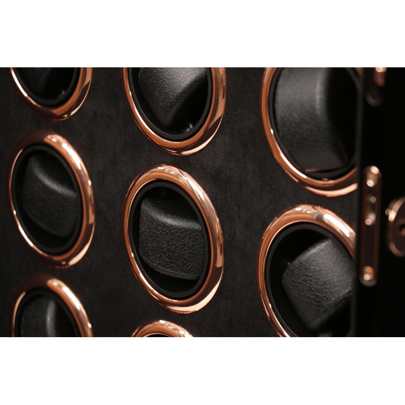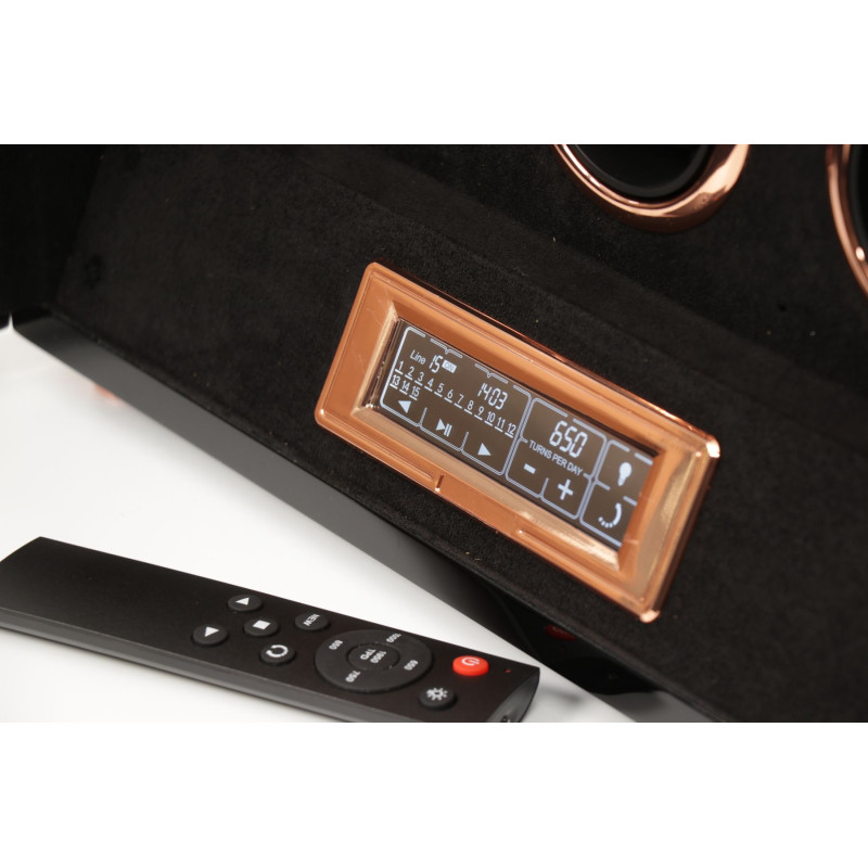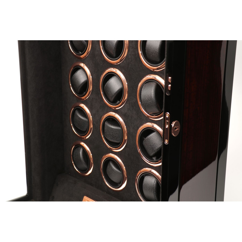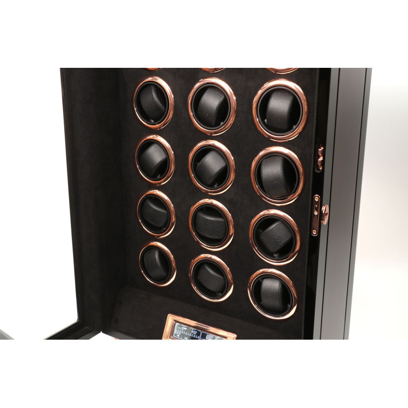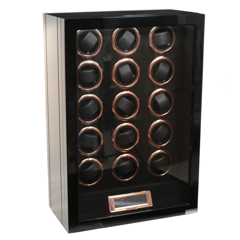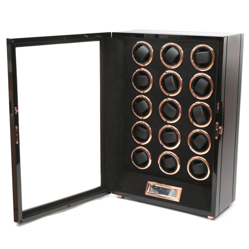 15 мест для ваших любимых часов. Благодаря автоматическому стопу при открывании дверцы, вы можете быть уверены, что ваши часы всегда будут защищены от повреждений. Японский механизм Mabuchi гарантирует плавный и бесшумный подзавод, продлевая срок службы ваших часов. Черный деревянный корпус и бархатный интерьер создают атмосферу роскоши. Сенсорное управление и пульт ДУ позволяют легко управлять шкатулкой. LED подсветка позволяет легко найти нужные часы даже в темноте.