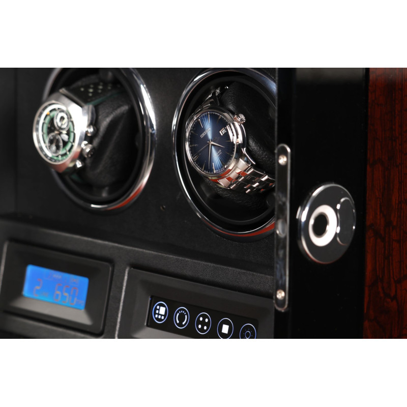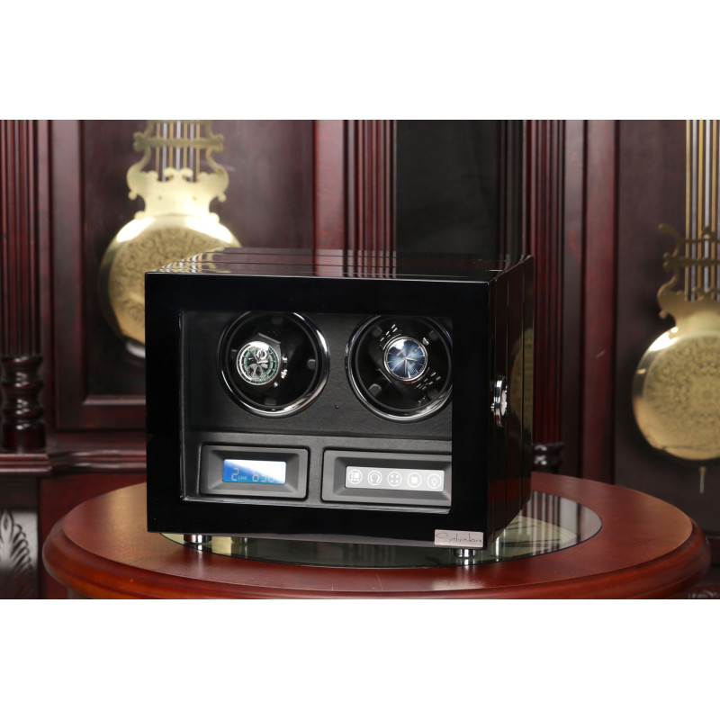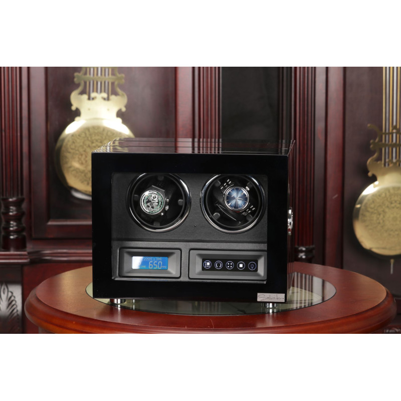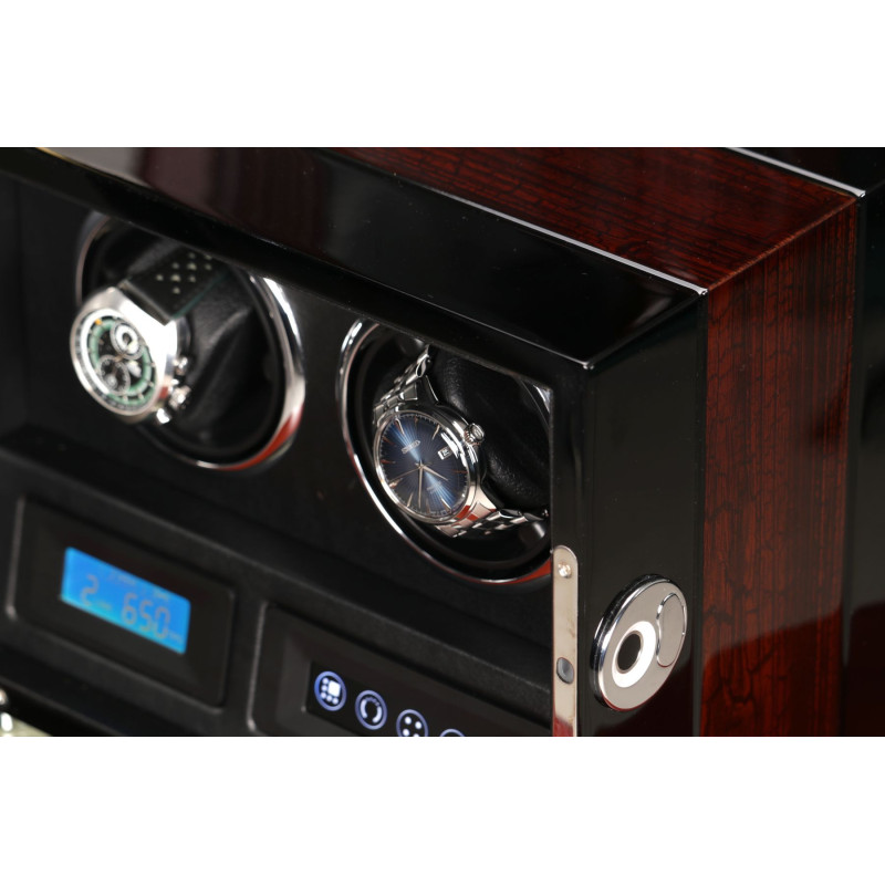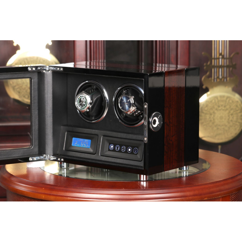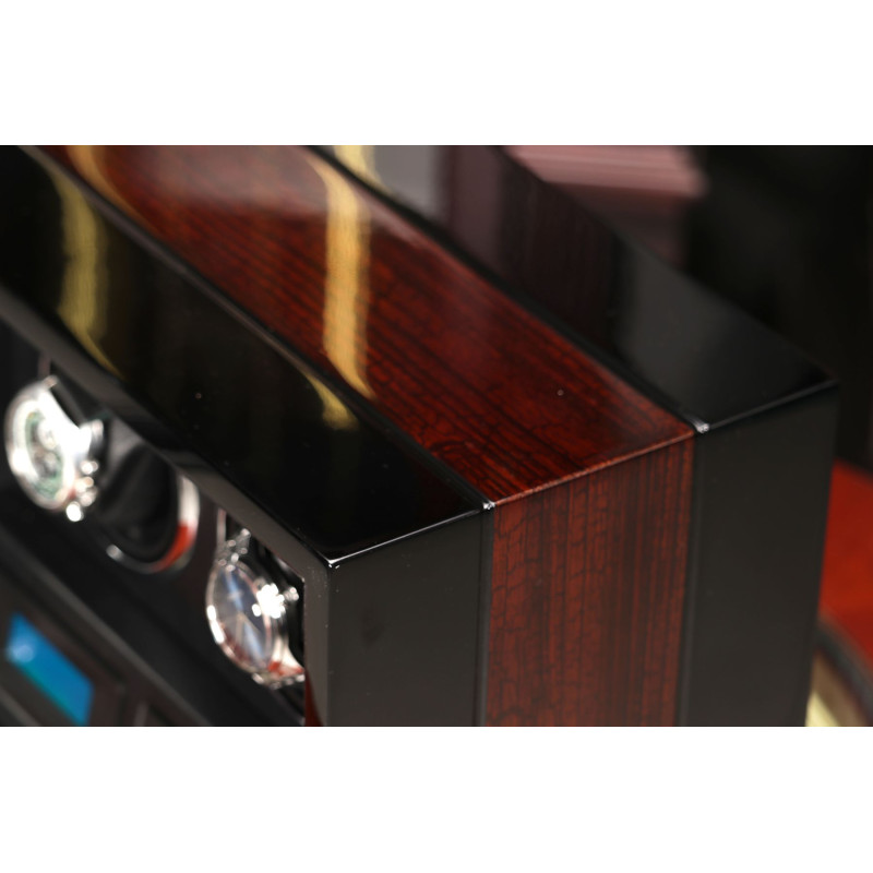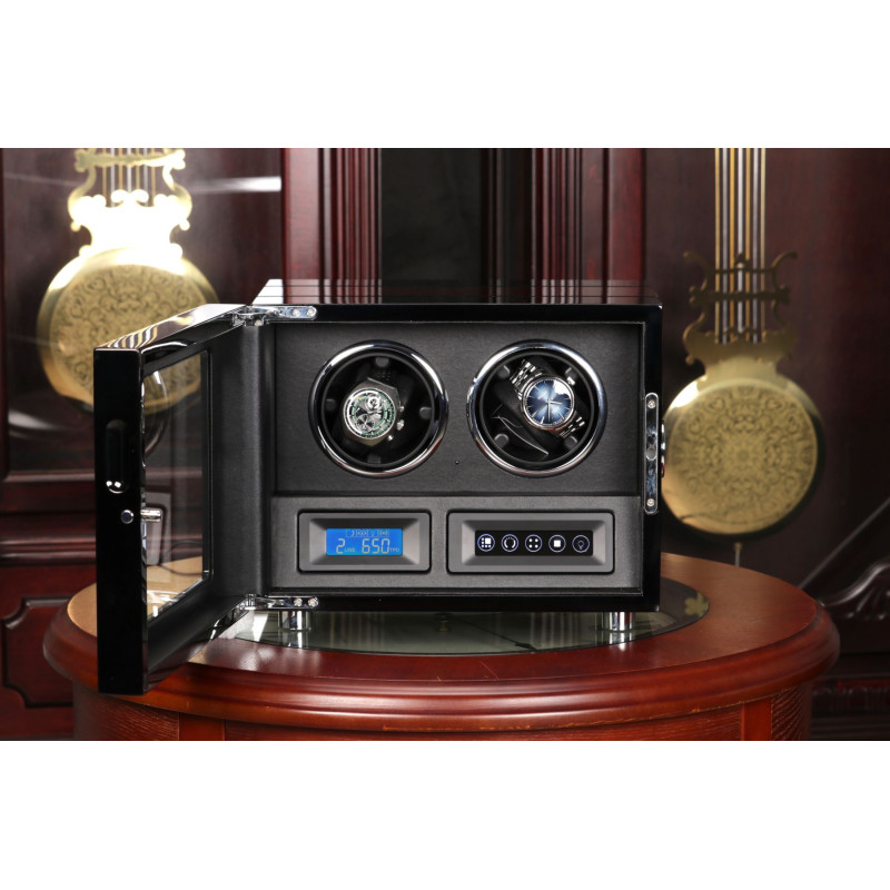 Корпус шкатулки изготовлен из натурального дерева, а внутренняя отделка выполнена из высококачественной PU кожи. Черный цвет придает изделию классический и элегантный вид, который идеально впишется в любой интерьер. Сенсорное управление позволяет легко включать и выключать роторы. LED подсветка создает мягкое освещение внутри шкатулки, позволяя вам любоваться своими часами в любое время суток. Автостоп при открытии дверцы гарантирует безопасность ваших часов. Пульт дистанционного управления для дополнительного удобства.