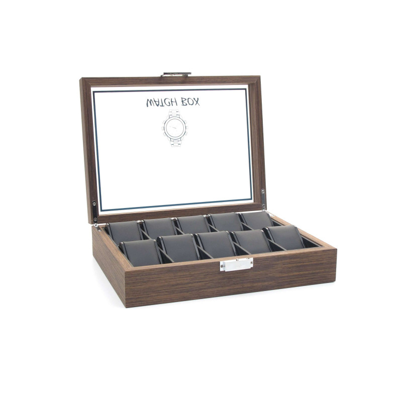 Корпус шкатулки выполнен из MDF и стекла, что обеспечивает надежную защиту часов. Внутренняя отделка выполнена из PU кожи черного цвета, создавая гармоничный интерьер.