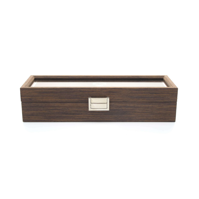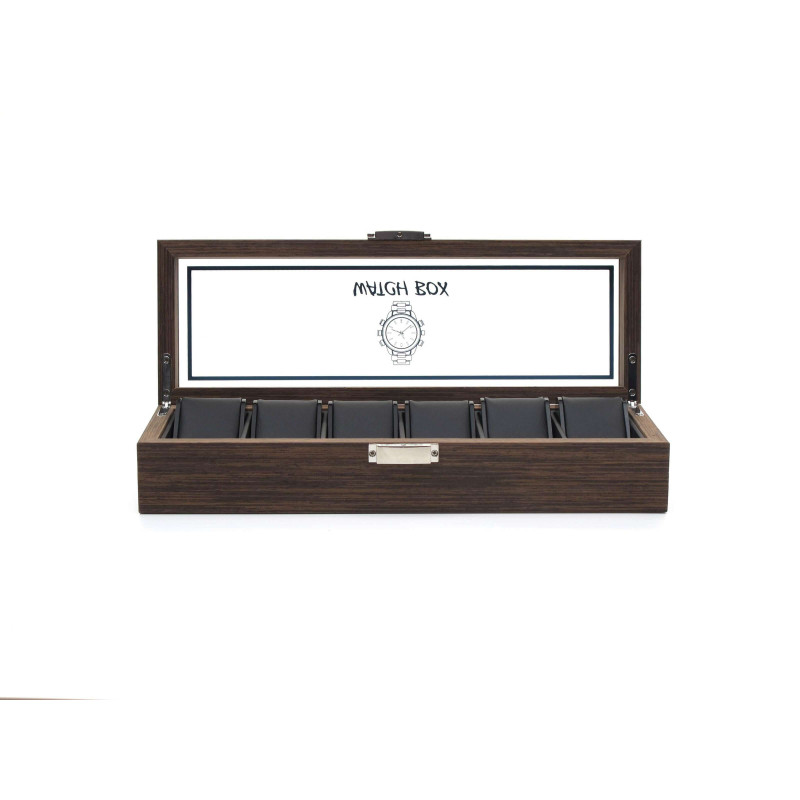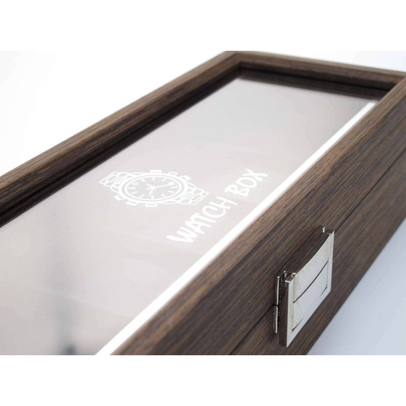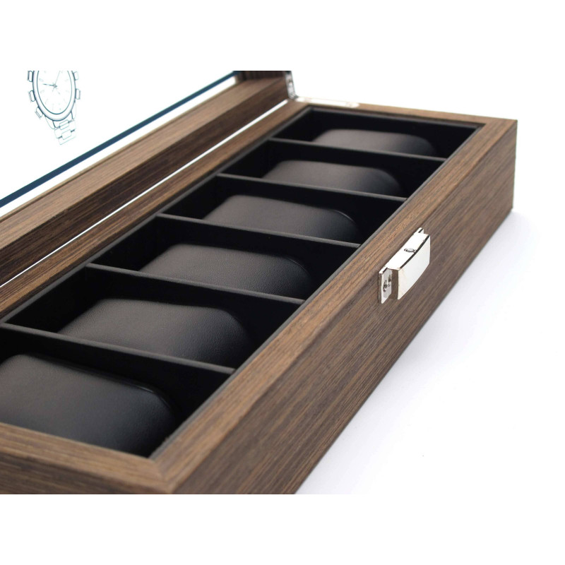 Коричневый цвет корпуса изготовлен из MDF и стекла, что обеспечивает надежную защиту часов внутри. Количество мест для хранения – 6, а интерьер выполнен из PU кожи черного цвета, что придает ему более утонченный вид.