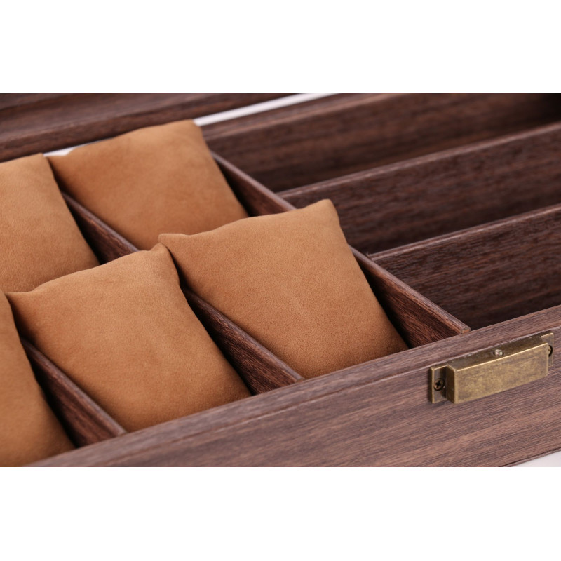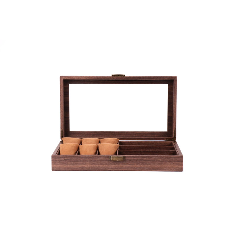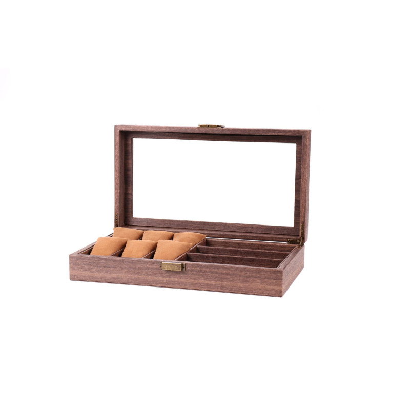 Эта изысканная шкатулка станет настоящим украшением вашего интерьера и позволит сохранить ваши аксессуары в безупречном состоянии. Корпус шкатулки изготовлен из высококачественной PU кожи с имитацией дерева, что придает ей элегантный и роскошный вид. Внутренняя отделка шкатулки выполнена из мягкого бархата, который надежно защитит ваши часы от царапин и пыли. Шкатулка оснащена 6 мягкими подушечками для часов и 3 отделениями для очков, что позволяет удобно разместить всю вашу коллекцию. Классический дизайн шкатулки в коричневых тонах подойдет к любому интерьеру. Компактные размеры позволяют разместить шкатулку даже на небольшом туалетном столике.