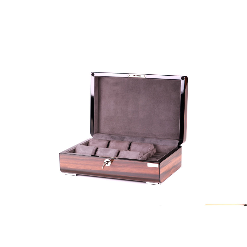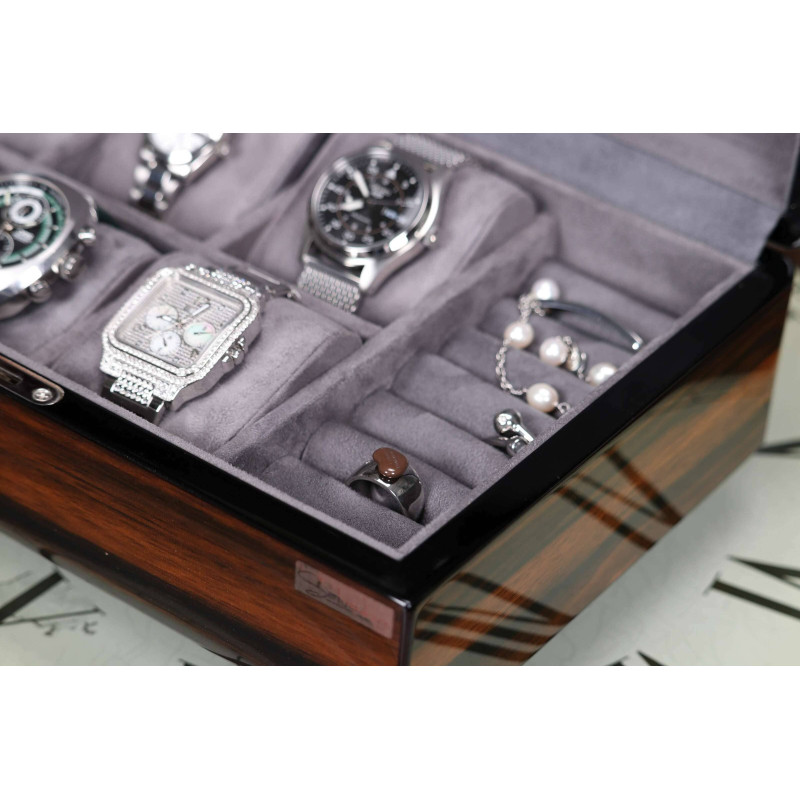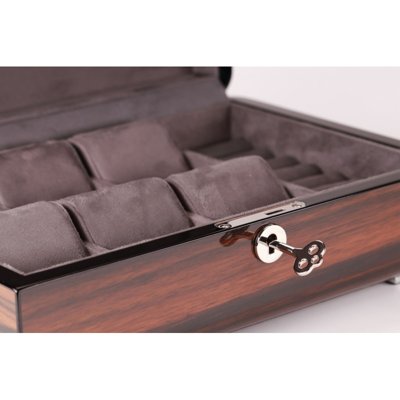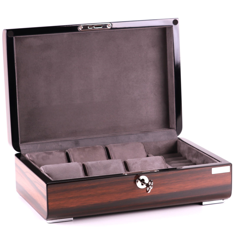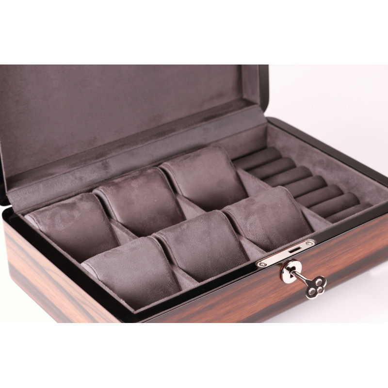 Шкатулка имеет размер 29,5х20х9см и вмещает до 6 часов. Для каждых часов предусмотрено индивидуальное место с бархатным интерьером серого цвета, который защитит их от царапин и других повреждений. Кроме того, в шкатулке есть отделение для украшений, где можно хранить кольца, серьги, браслеты и другие мелочи.