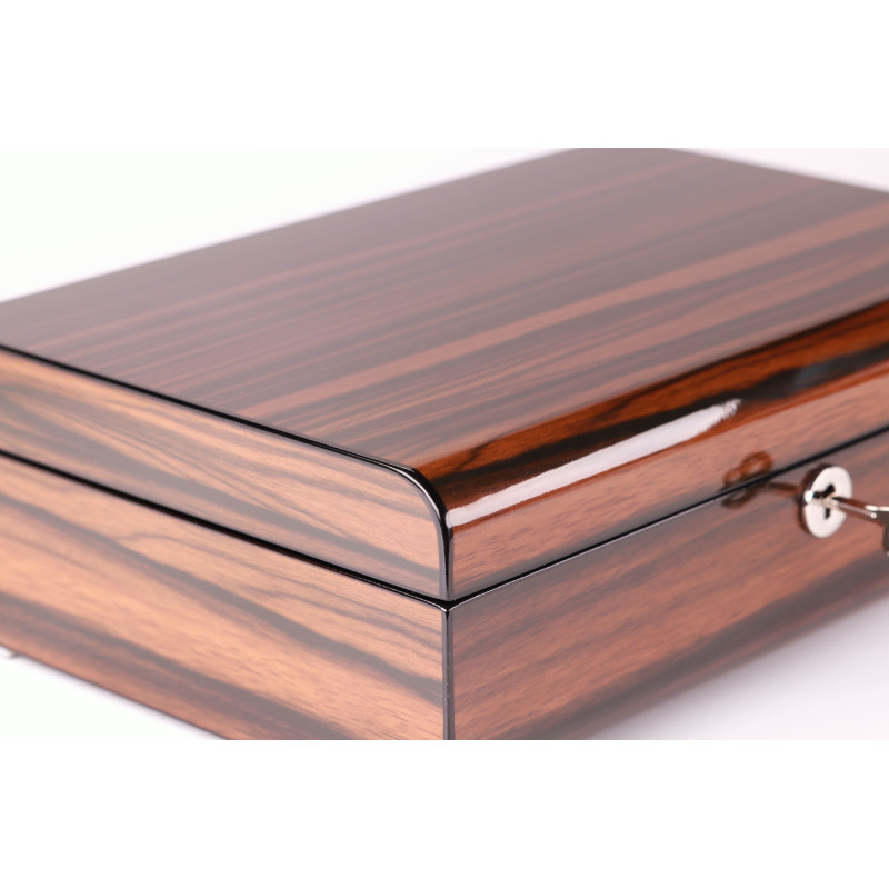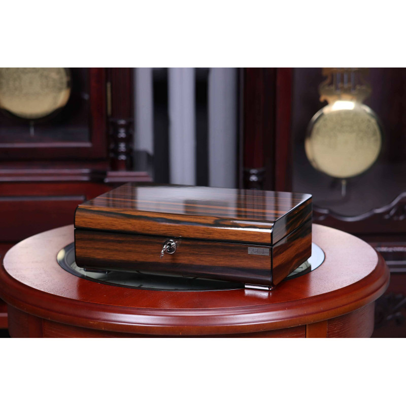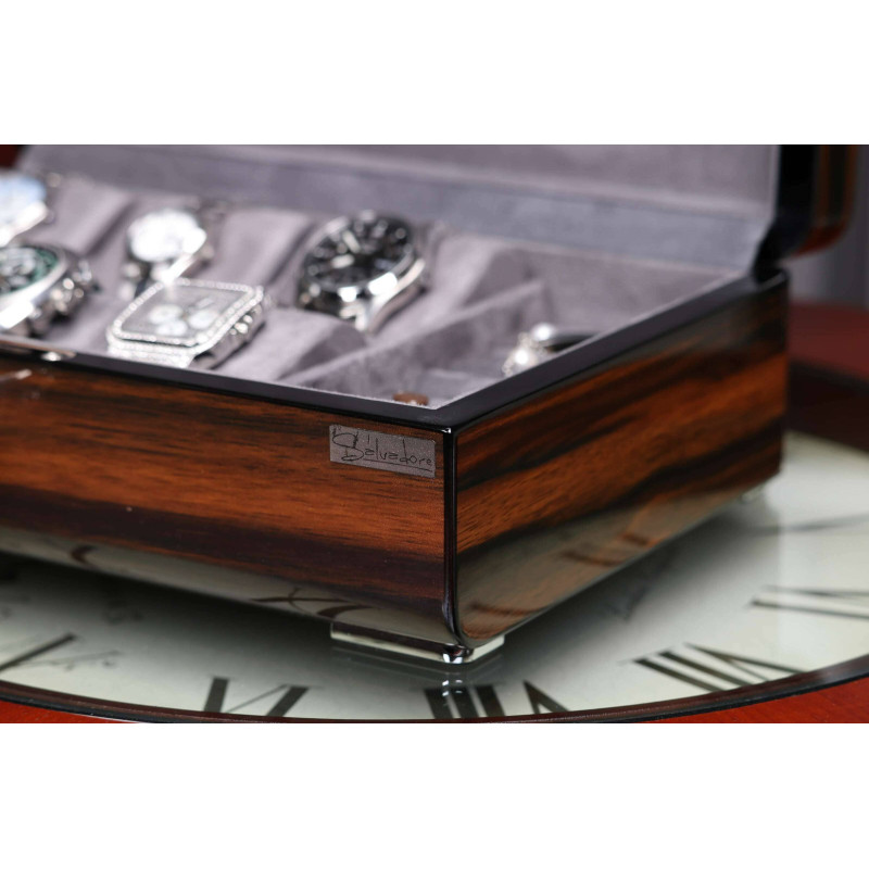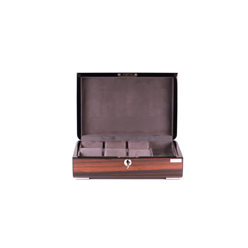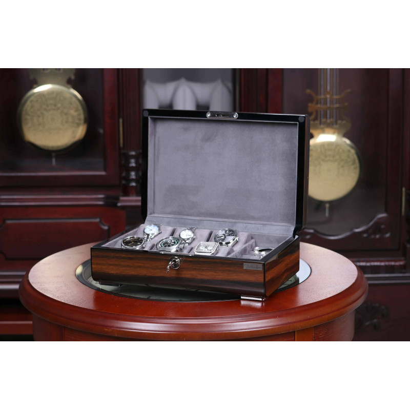 Шкатулка имеет размер 29,5х20х9см и вмещает до 6 часов. Для каждых часов предусмотрено индивидуальное место с бархатным интерьером серого цвета, который защитит их от царапин и других повреждений. Кроме того, в шкатулке есть отделение для украшений, где можно хранить кольца, серьги, браслеты и другие мелочи.