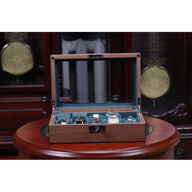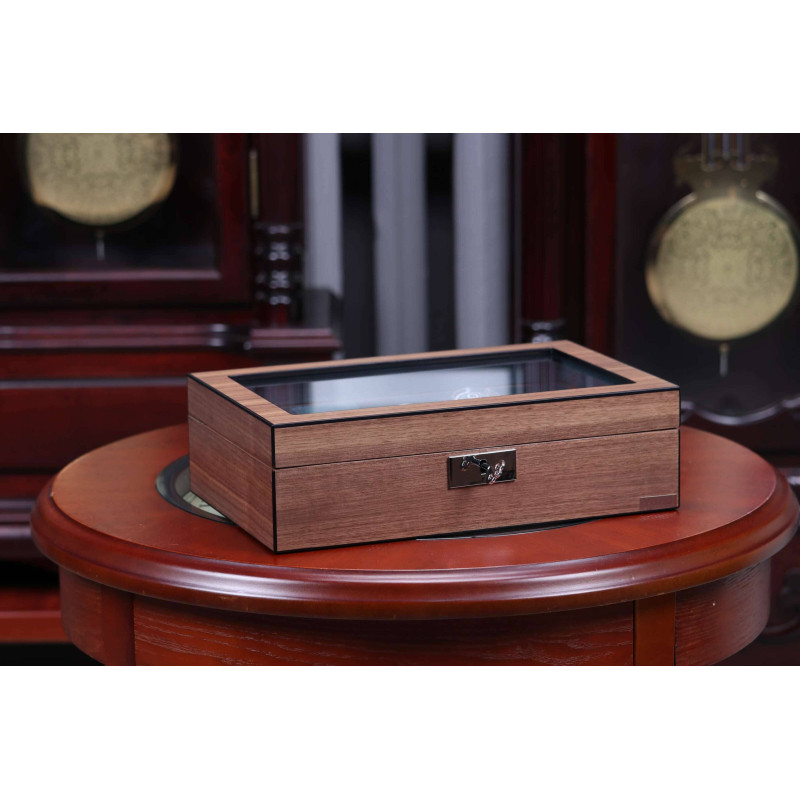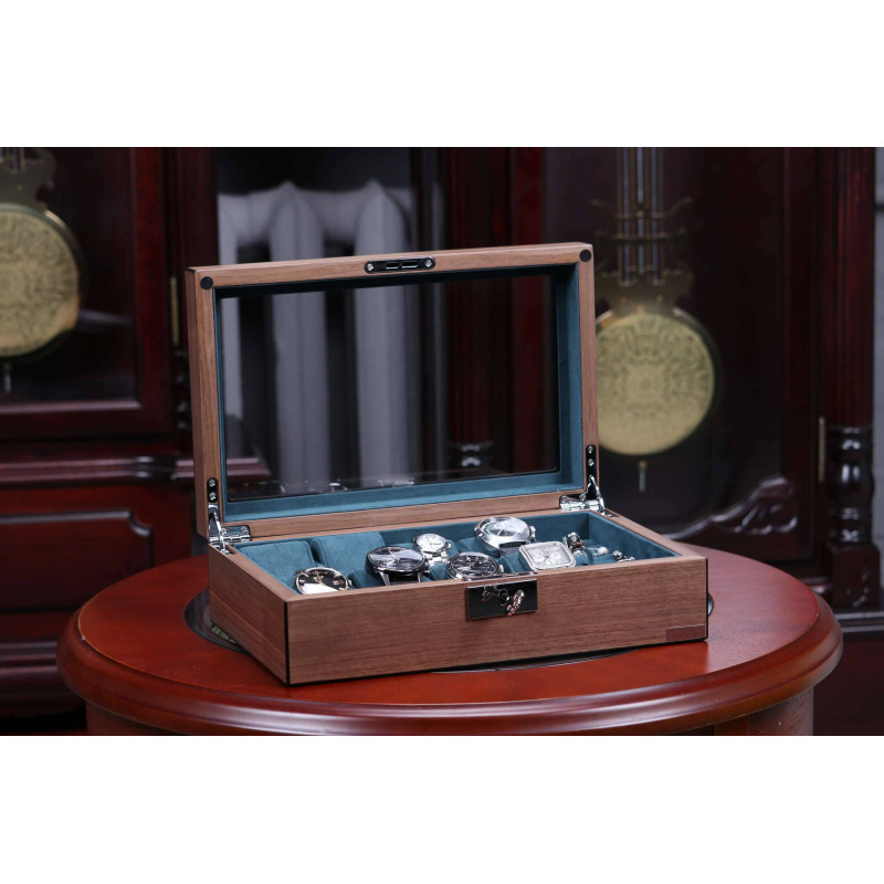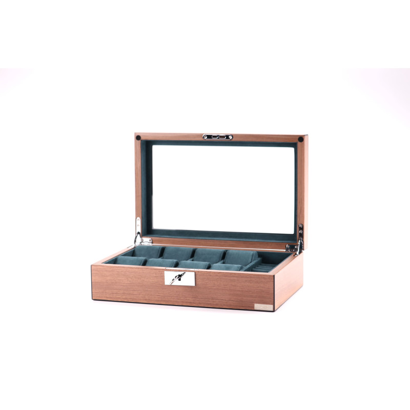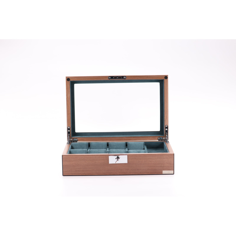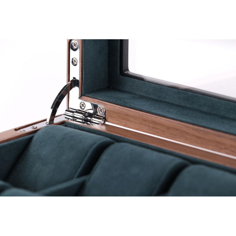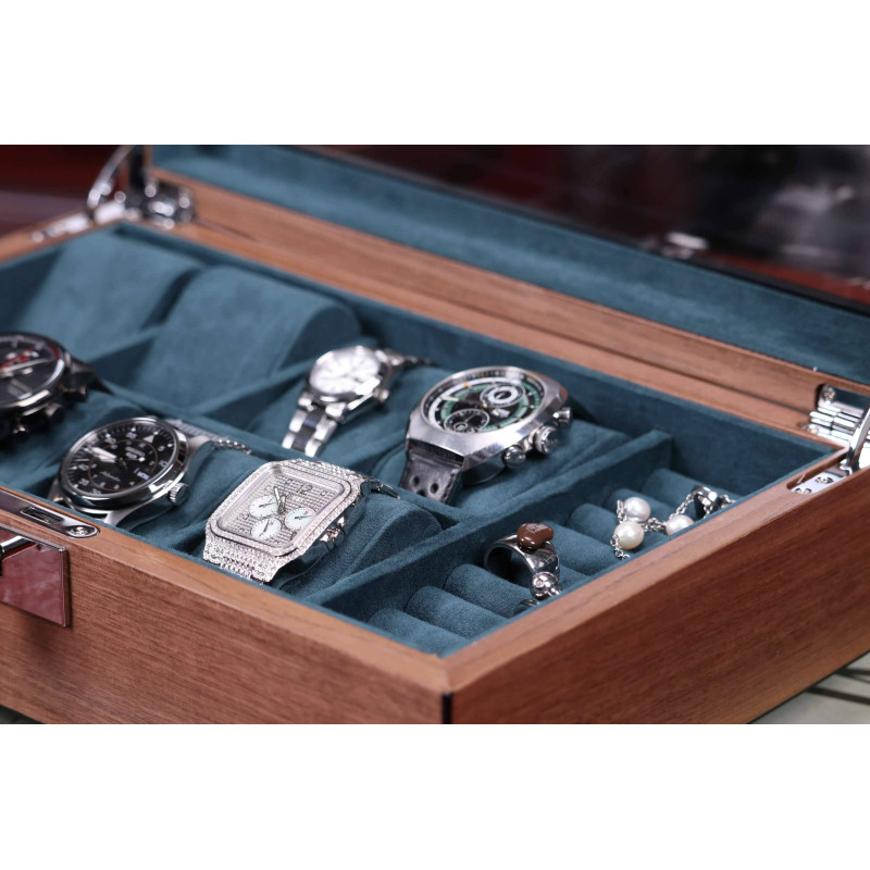 Кейс для часов вмещает до восьми предметов, позволяя организовать хранение украшений и аксессуаров наиболее удобным образом. Отсеки имеют бархатное покрытие темно-зеленого цвета, которое не только заботится о сохранности ценных предметов, но и придает шкатулке особый шарм.