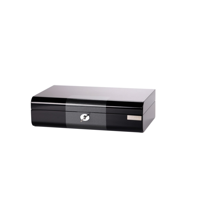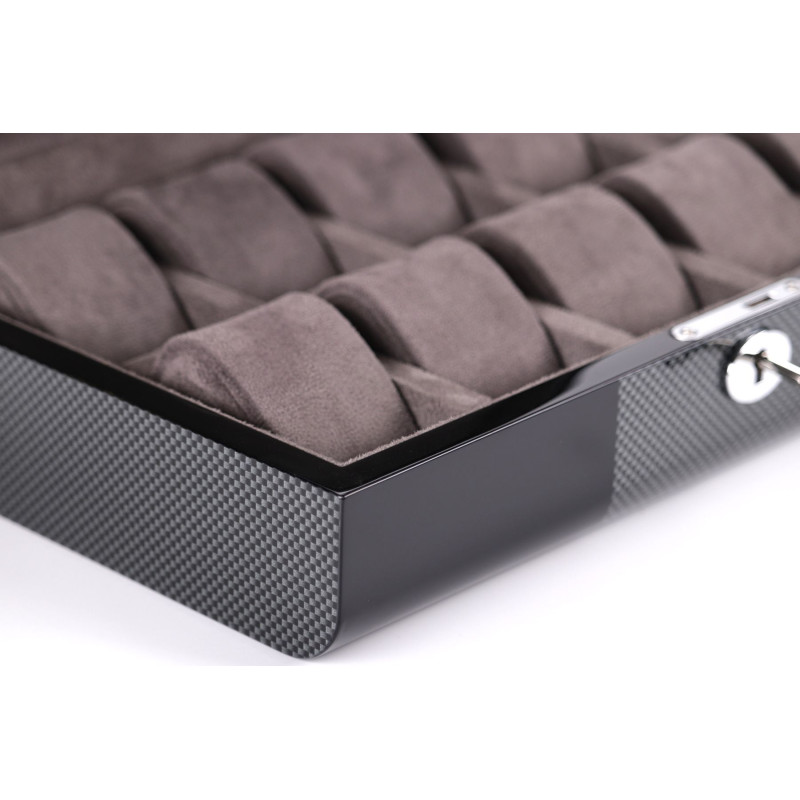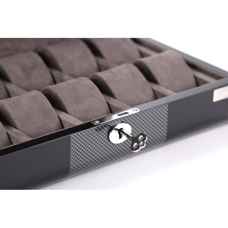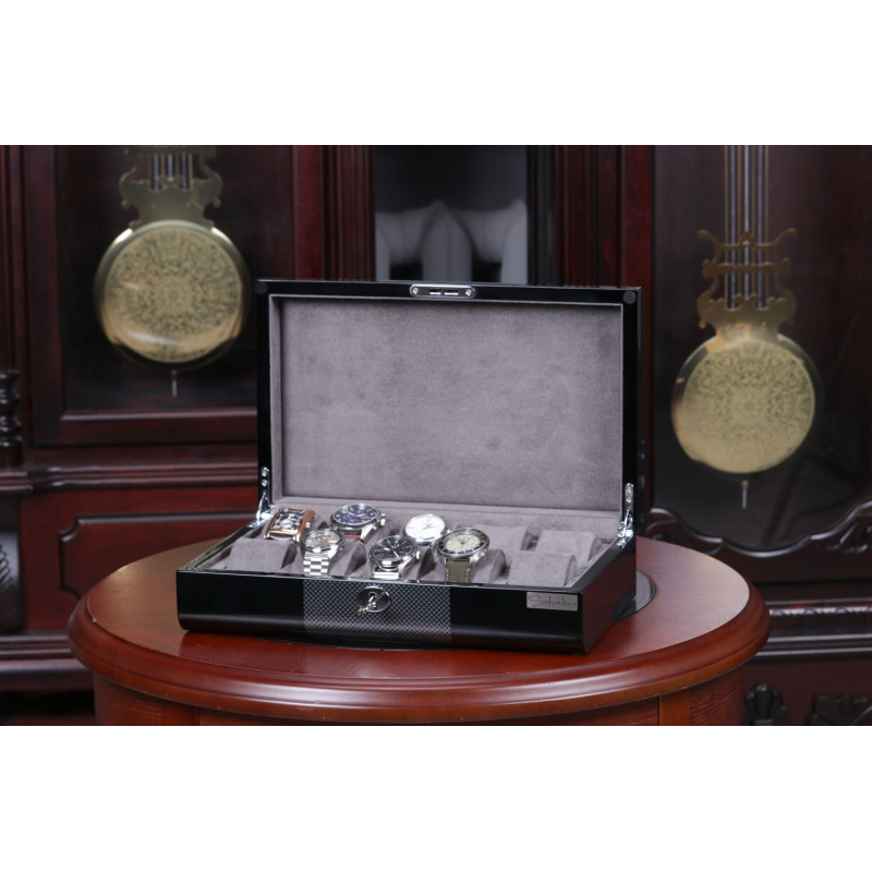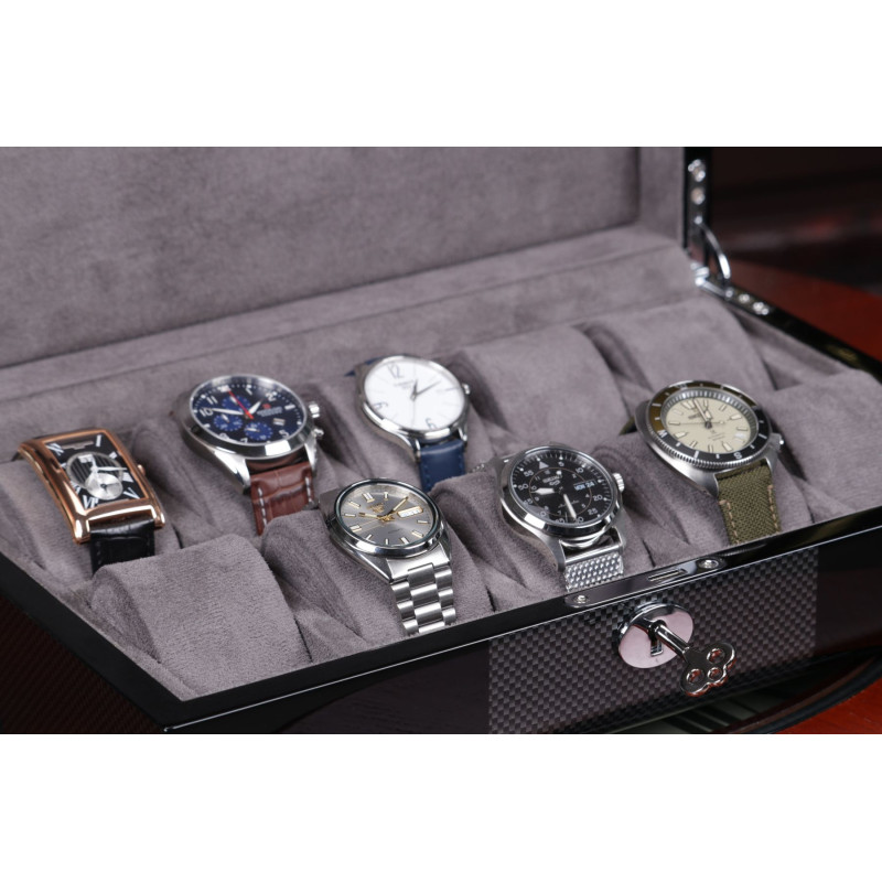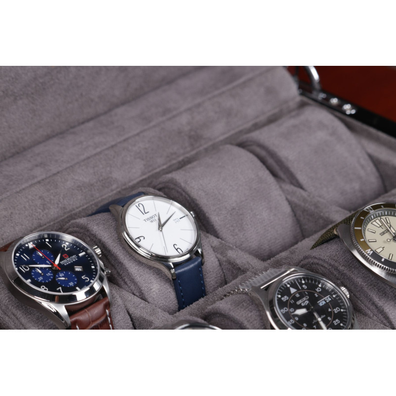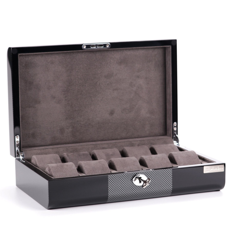 Мягкий серый бархат надежно защитит ваши часы от царапин и пыли, а элегантный черный цвет корпуса подчеркнет их красоту. Шкатулка вмещает до 10 часов, что позволяет хранить всю вашу коллекцию в одном месте. Произведенная в Австрии компанией Salvadore, эта шкатулка сочетает в себе традиционные ремесленные навыки и современный дизайн.