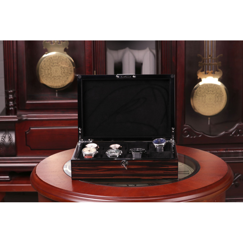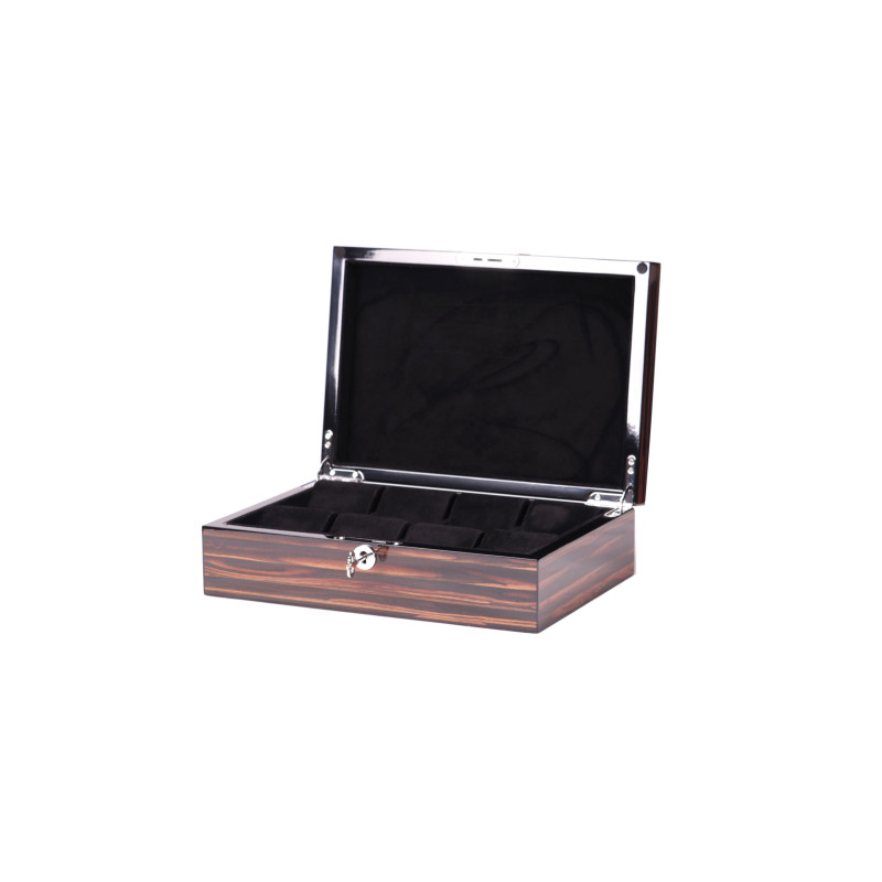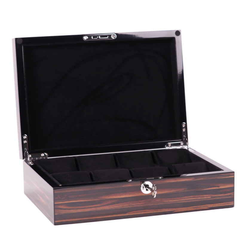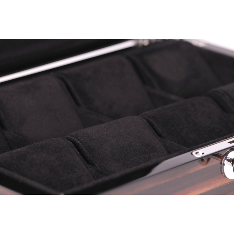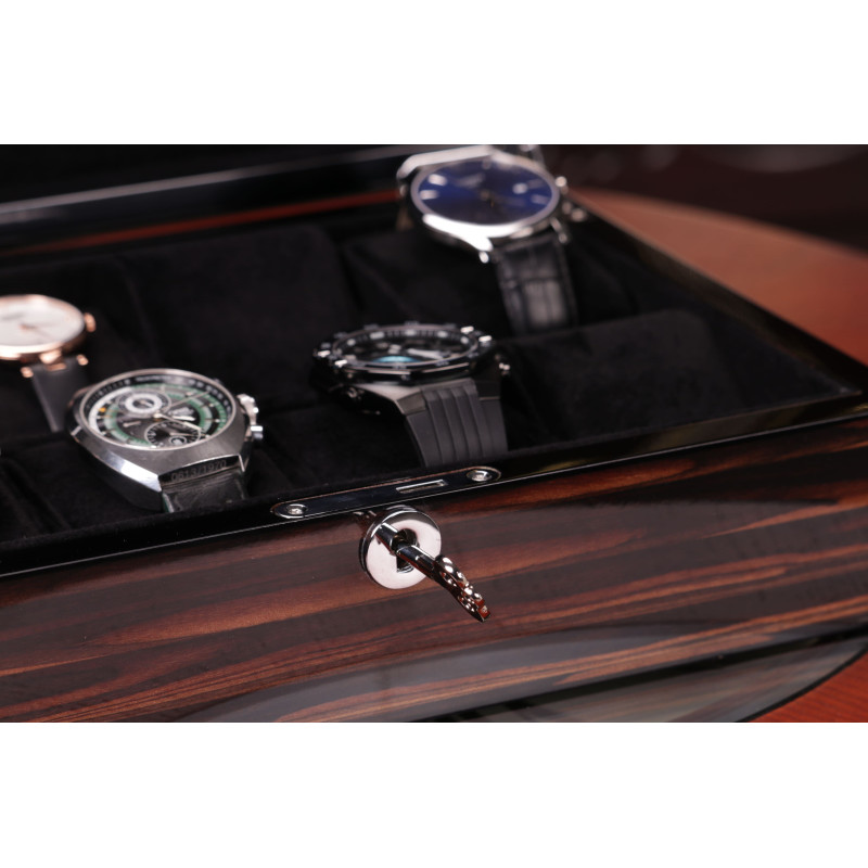 Основной основой коробки является дерево, которое гарантирует ее долговечность и износостойкость. В этом кейсе не предусмотрено автоматического подзавода часов, но он имеет 8 мест для их хранения. Всем часам приделяется свое отдельное отделение, что обеспечивает их защиту от повреждений и ответственное хранение.