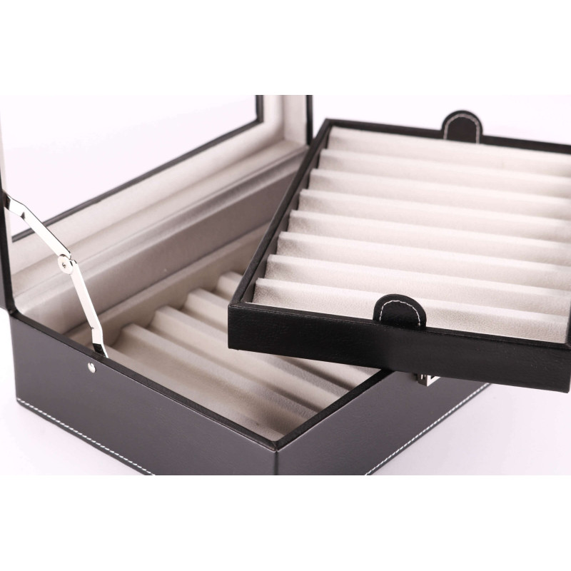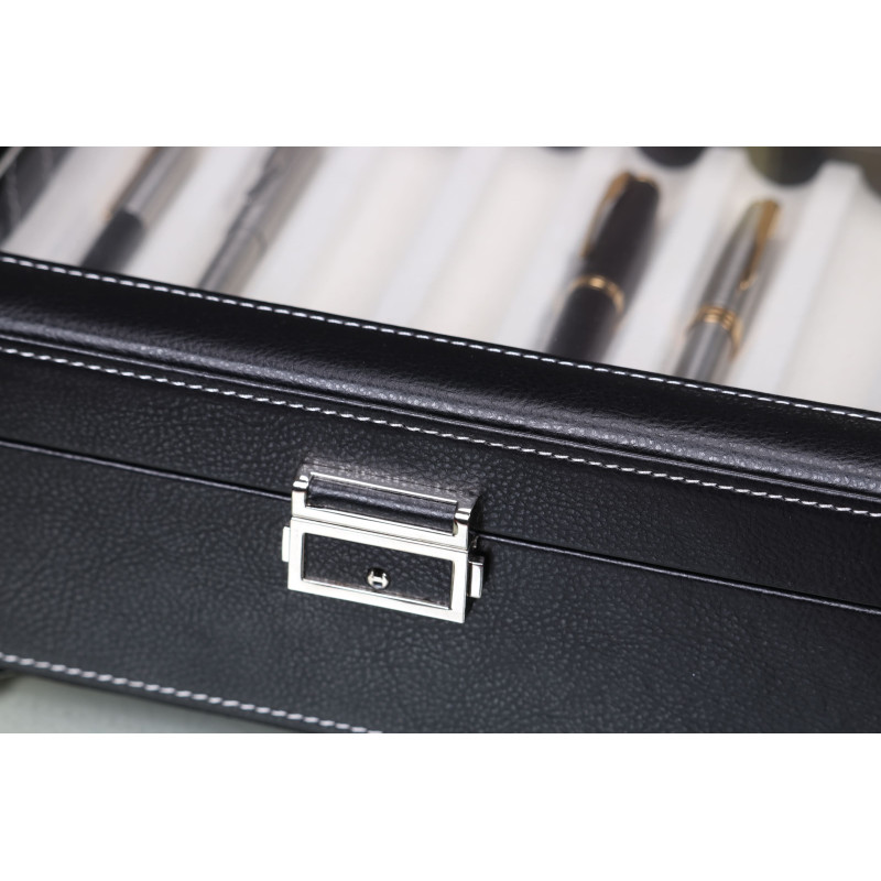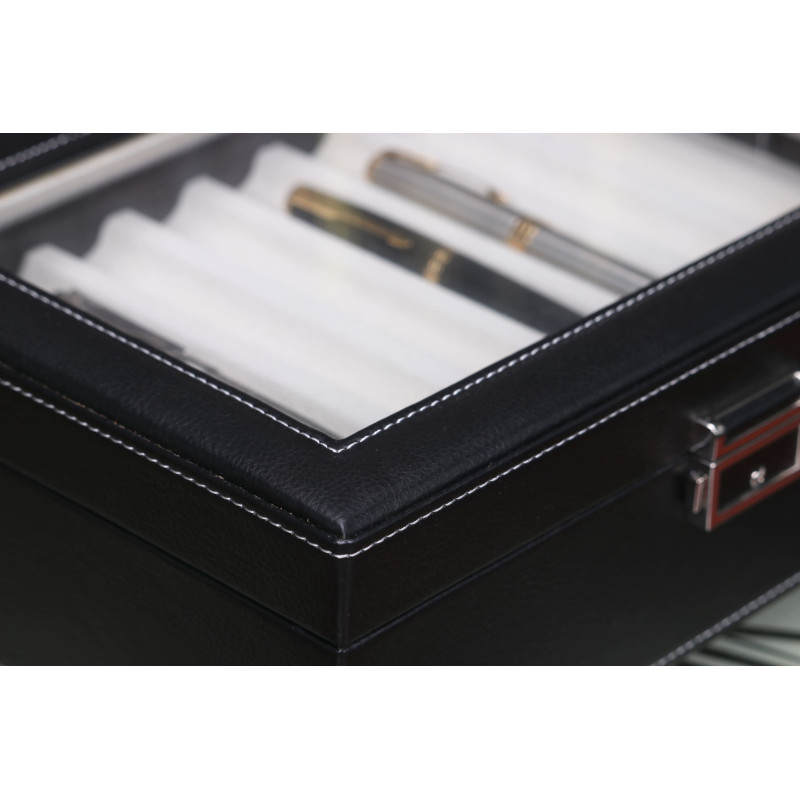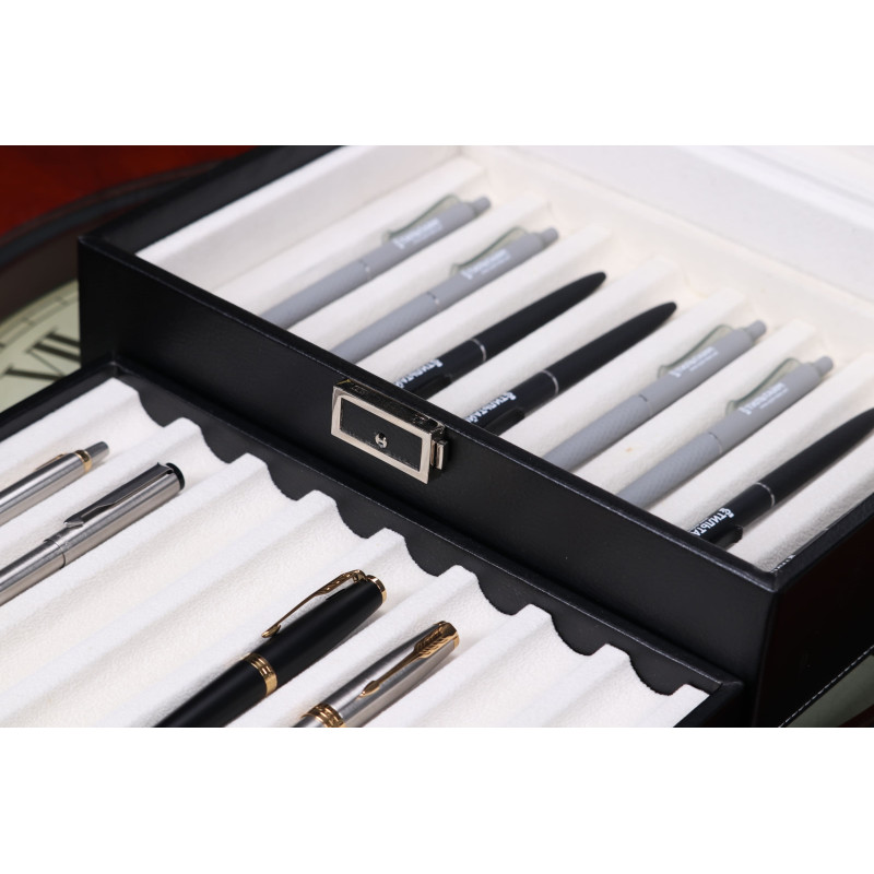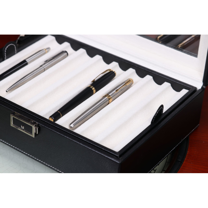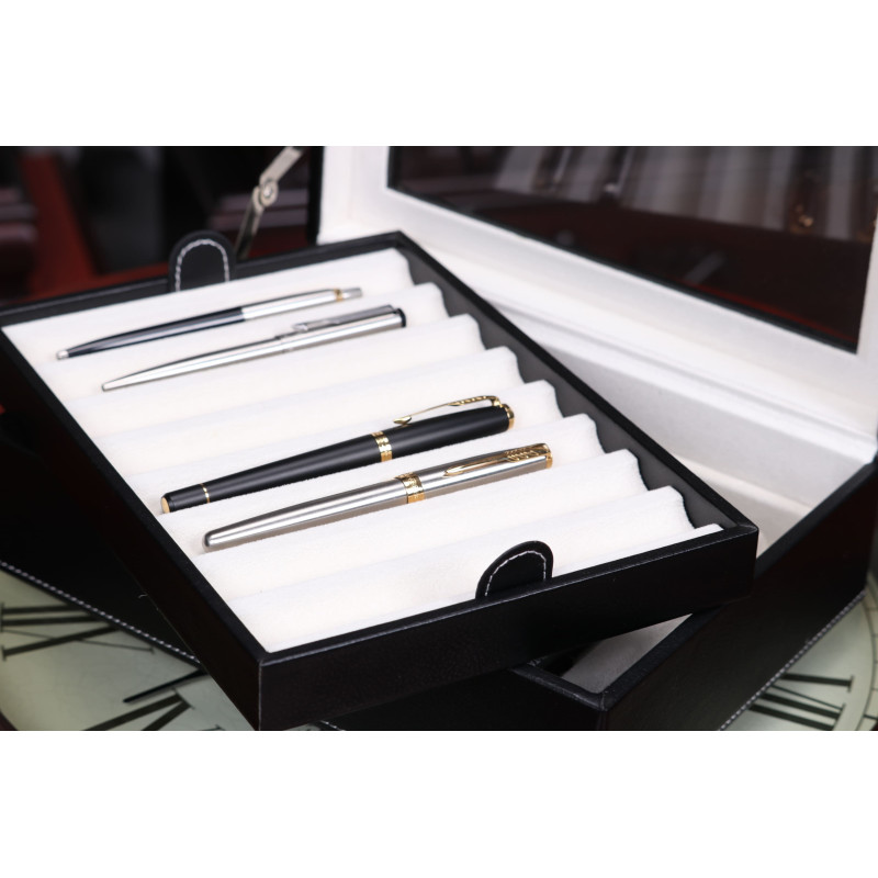 Внутри шкатулки находятся 16 ячеек для хранения ручек. Кроме того, интерьер выполнен из светлого бархата, что защищает инструменты от царапин и повреждений. Через прозрачную крышку легко можно выбрать нужную ручку и быстро найти нужный аксессуар.