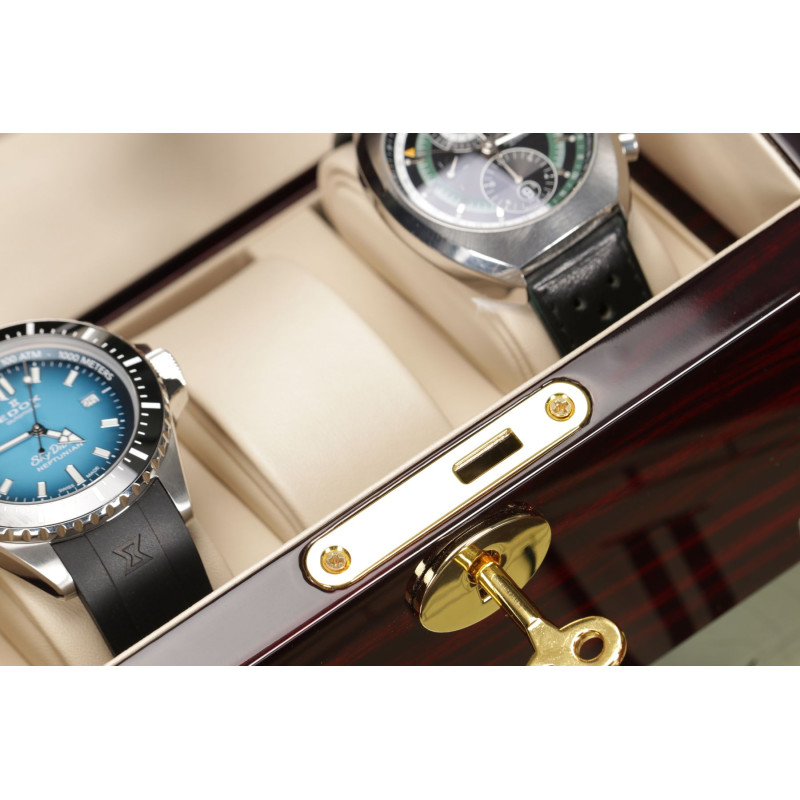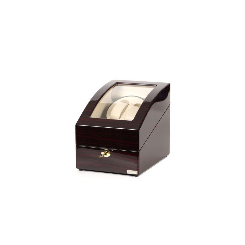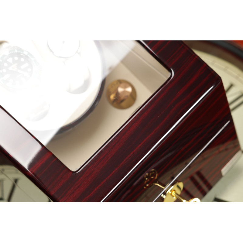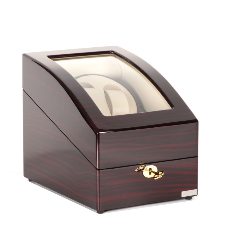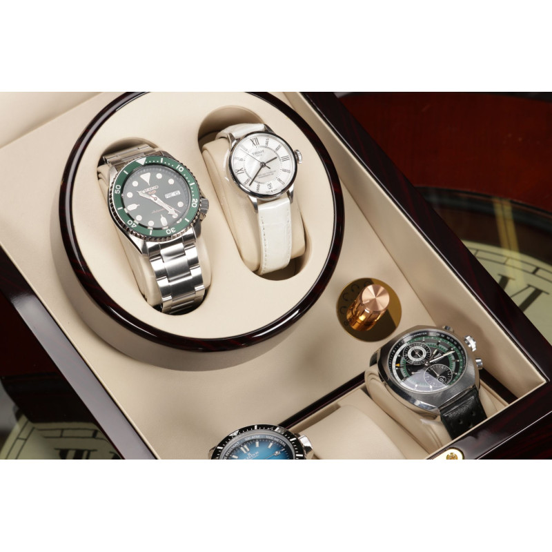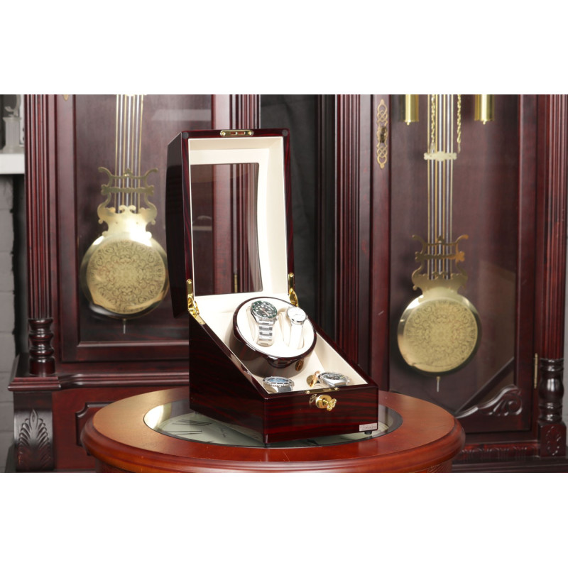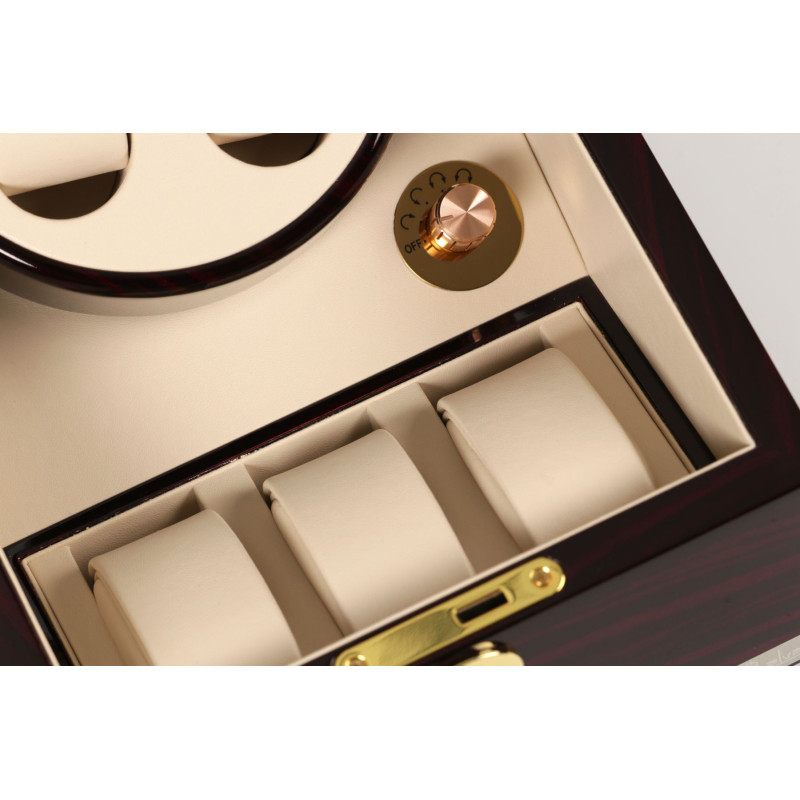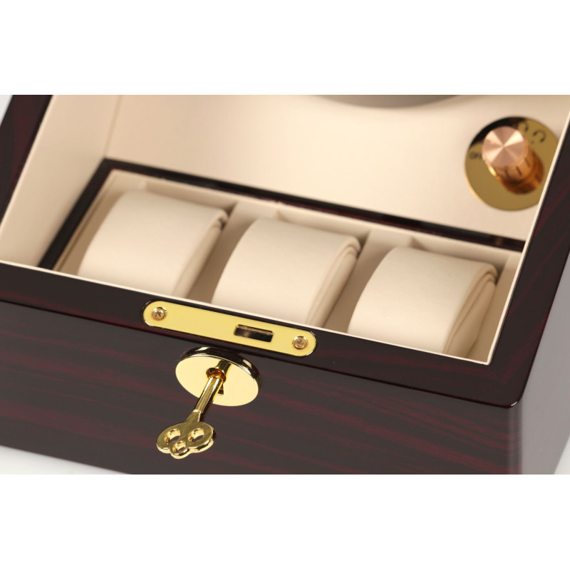 Внутри кейса расположены три места для хранения часов с интерьером из светлой PU кожи. Шкатулка имеет возможность автоподзавода для двух часов, механическое управление, замок, автостоп и возможность работы от батарейки типа D.