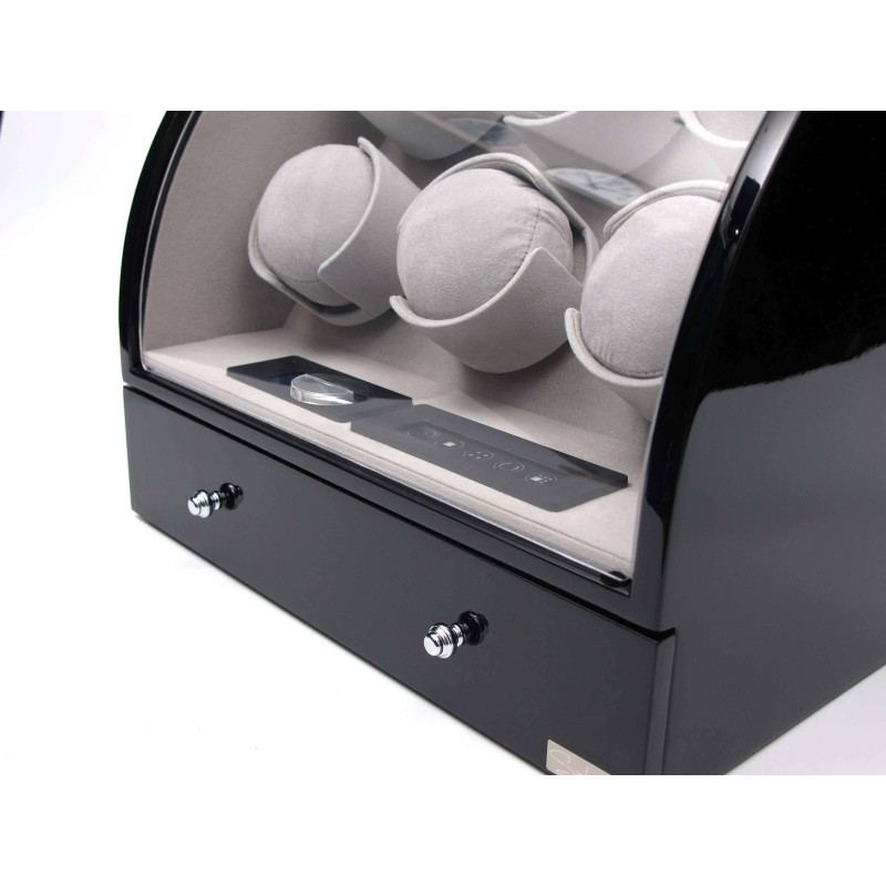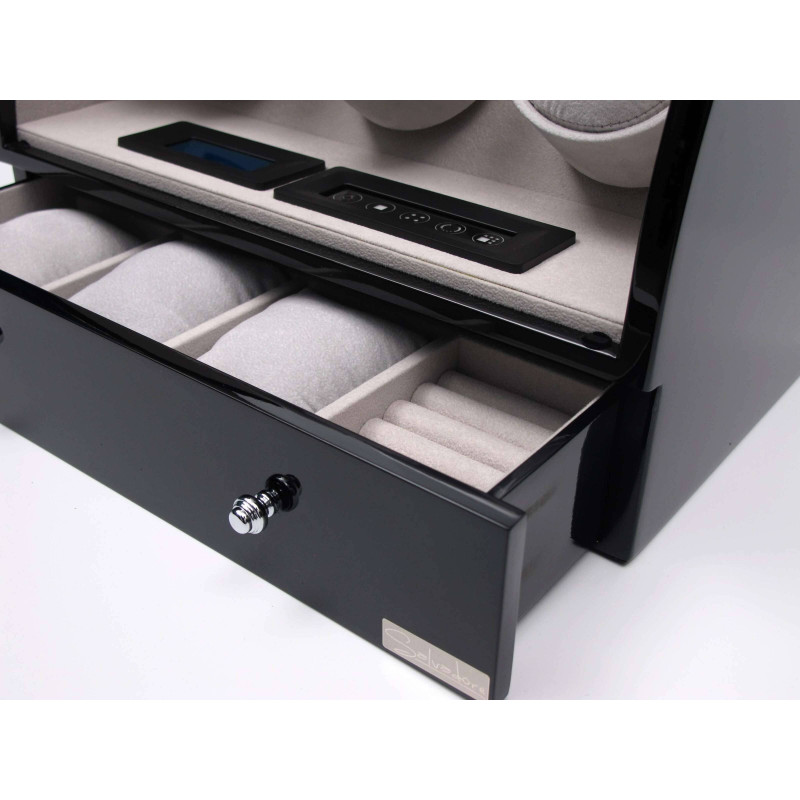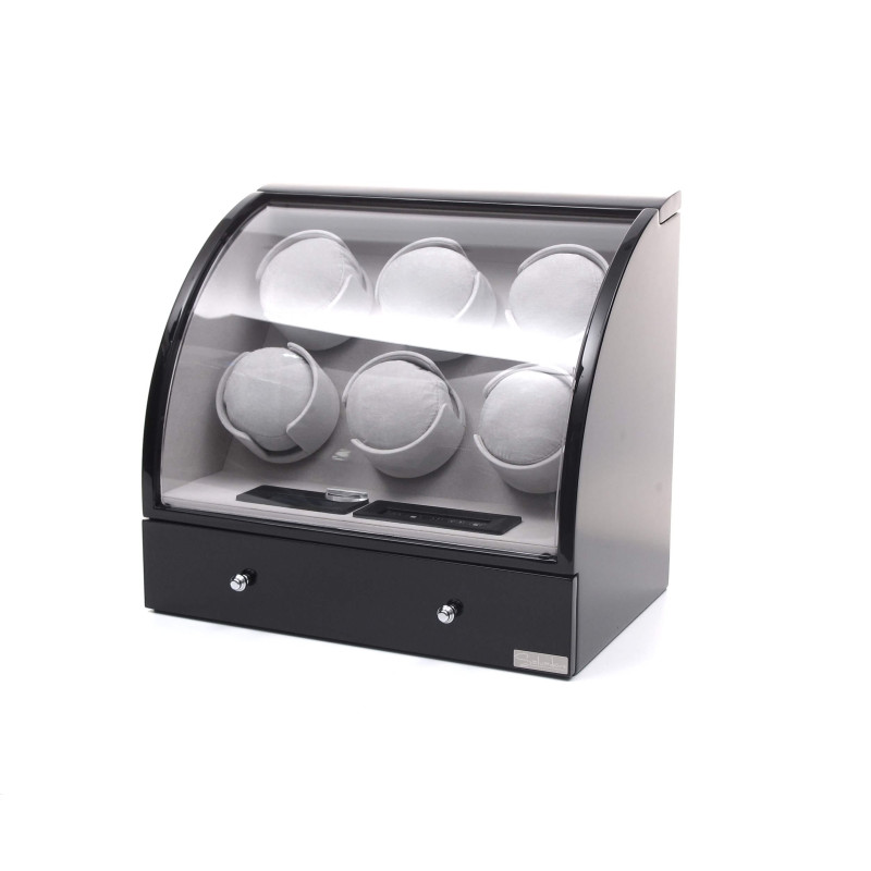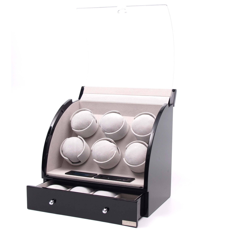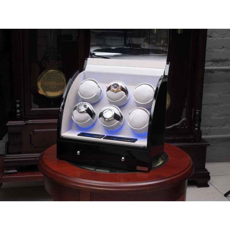 Кейс для часов оснащен автоподзаводом, что позволяет поддерживать работу часов в постоянном состоянии. Внутри шкатулки находится 6 мест для хранения, а тонкий бархат светлого цвета придает интерьеру особый шарм. Кроме того, в кейсе имеется отделение для 3х часов и украшений, сенсорное управление и LED подсветка.