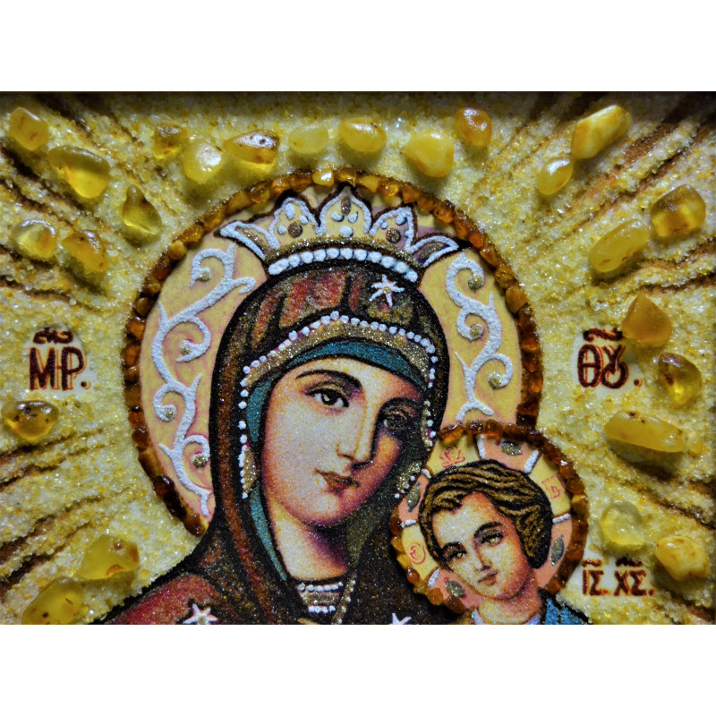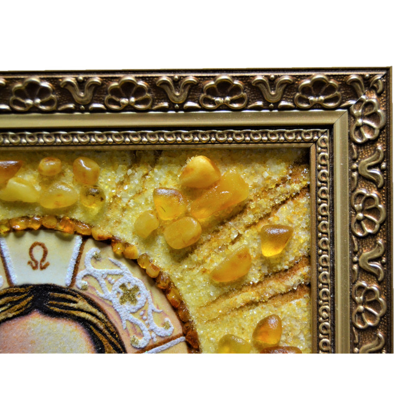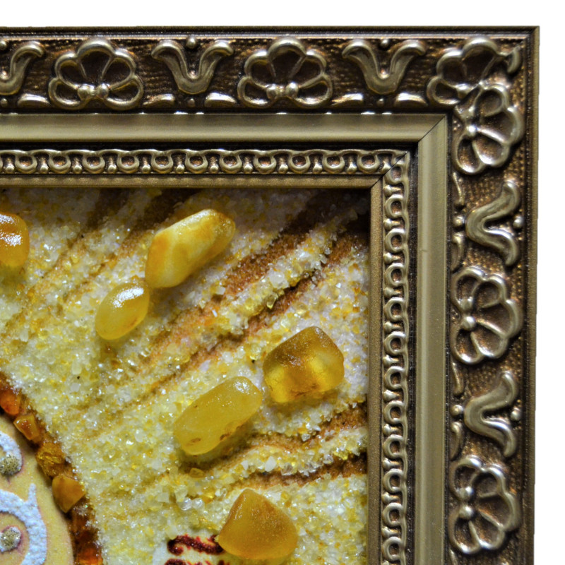 Данная венчальная пара икон выполнена профессиональным мастером насыпной и наборной техникой с применением янтарной крошки и драгоценных камней разных размеров. Янтарные иконы оформлены в багет на ваш выбор, а также по желанию, иконы возможно осуществить под стеклом.
