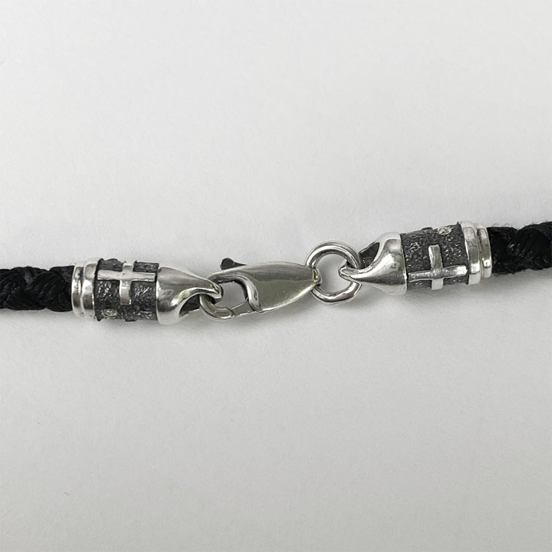 Также ювелирный шнур оснащен серебряной застежкой с изображением крестов.