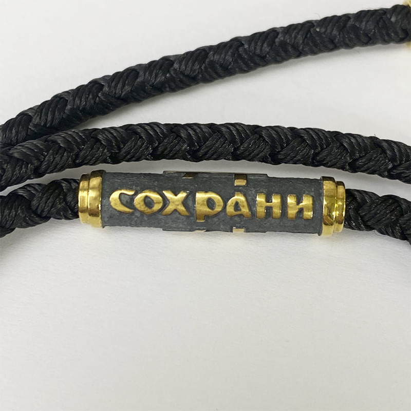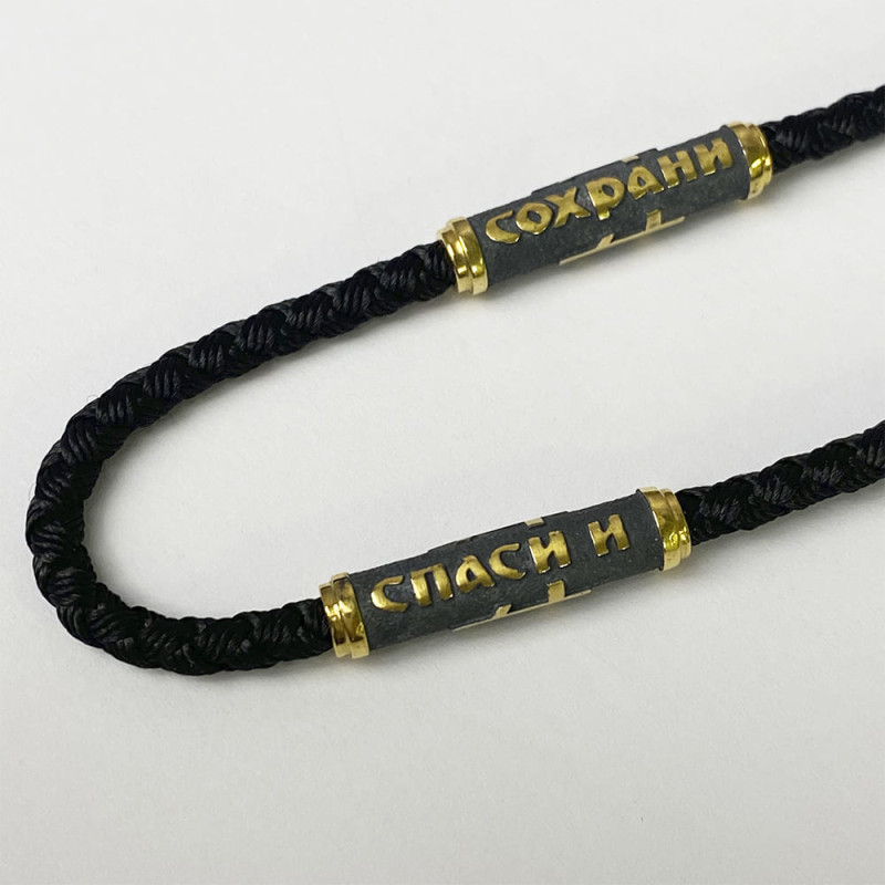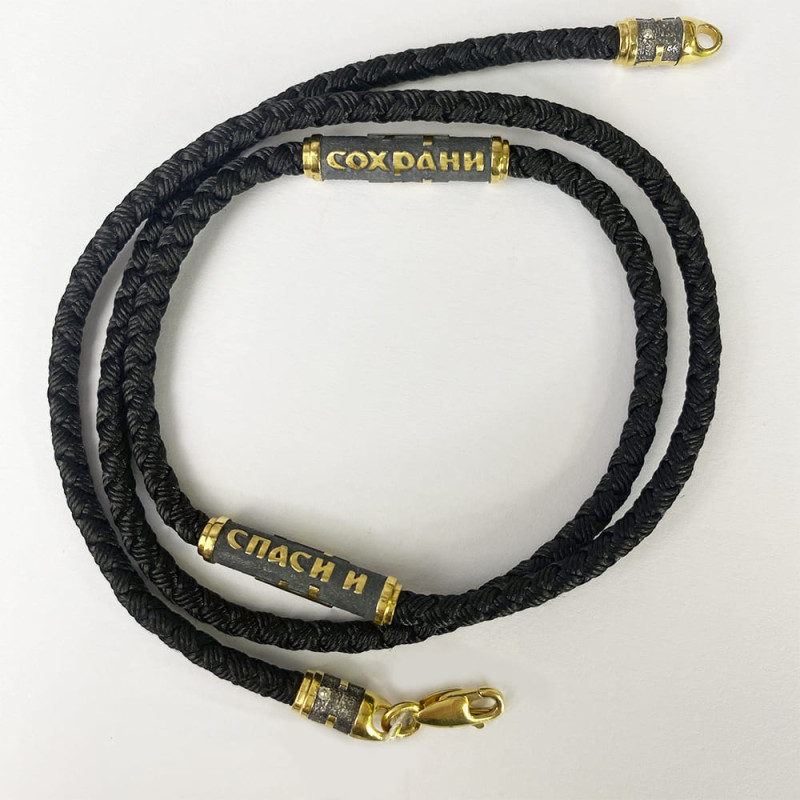 Шнурок имеет серебряные вставки с позолотой и чернением, на вставках изображена надпись "Спаси и Сохрани", длина вставок составляет 2.5 см. Толщина самого шнурка - 0.3 см.
