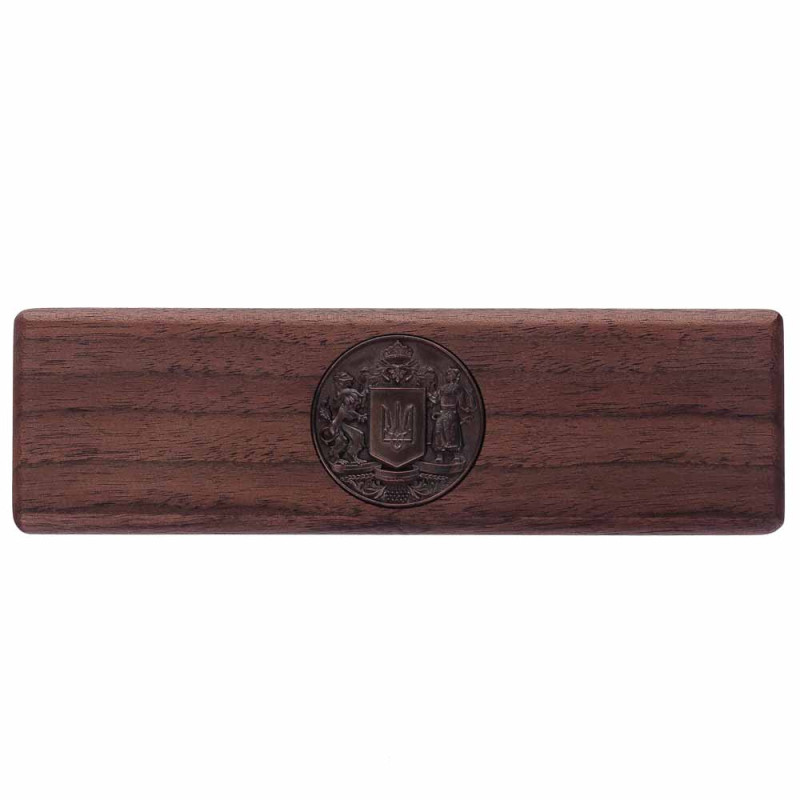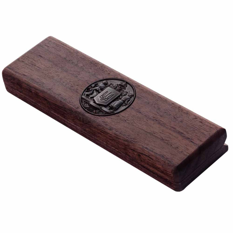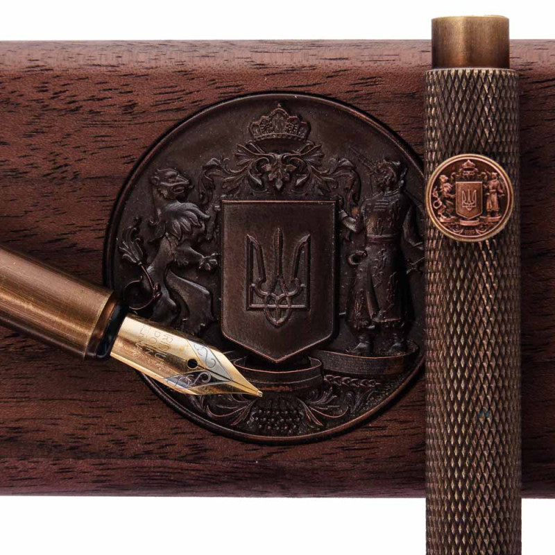 Футляр прикрашений бронзовим гербом, що повторює центральний символ на ручці. Така упаковка надає виробу ще більшої представницької вартості та ідеально підходить для офіційних подарунків.