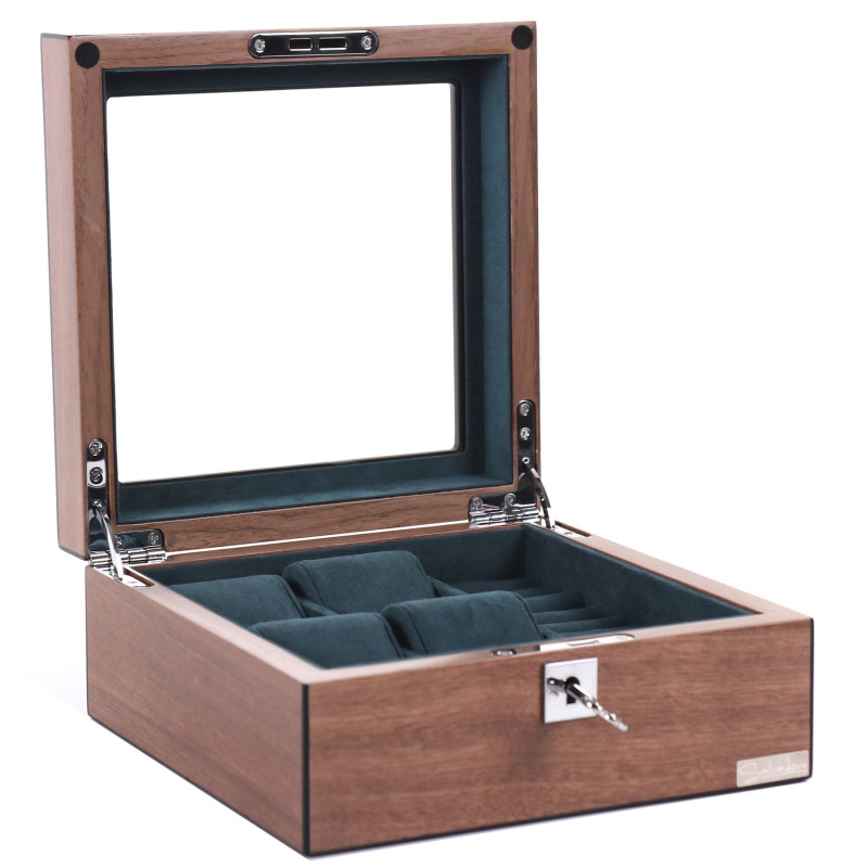 М'який оксамитовий інтер'єр темно-зеленого кольору дбайливо збереже ваш годинник від подряпин та пилу. Чотири окремі комірки шириною 51 мм дозволять акуратно розмістити до 4 годинників. Класичний дизайн у кольорі горіх із матовим покриттям ідеально поєднується з будь-яким інтер'єром. Виробник Salvadore гарантує високу якість та довговічність виробу. Скринька Salvadore WB/2440/4.W – це не просто місце для зберігання, це витвір мистецтва. Її вишуканий дизайн підкреслить вашу індивідуальність та стане чудовим доповненням до інтер'єру вашого будинку чи офісу.