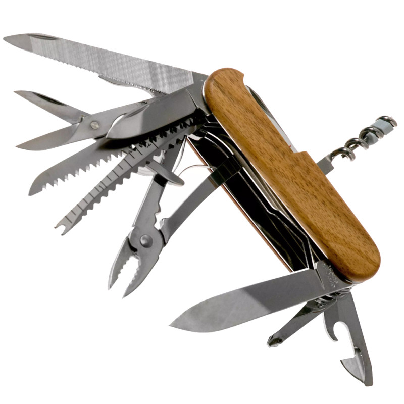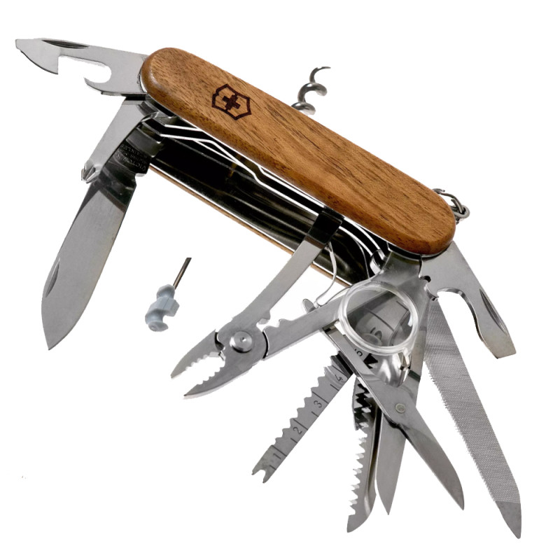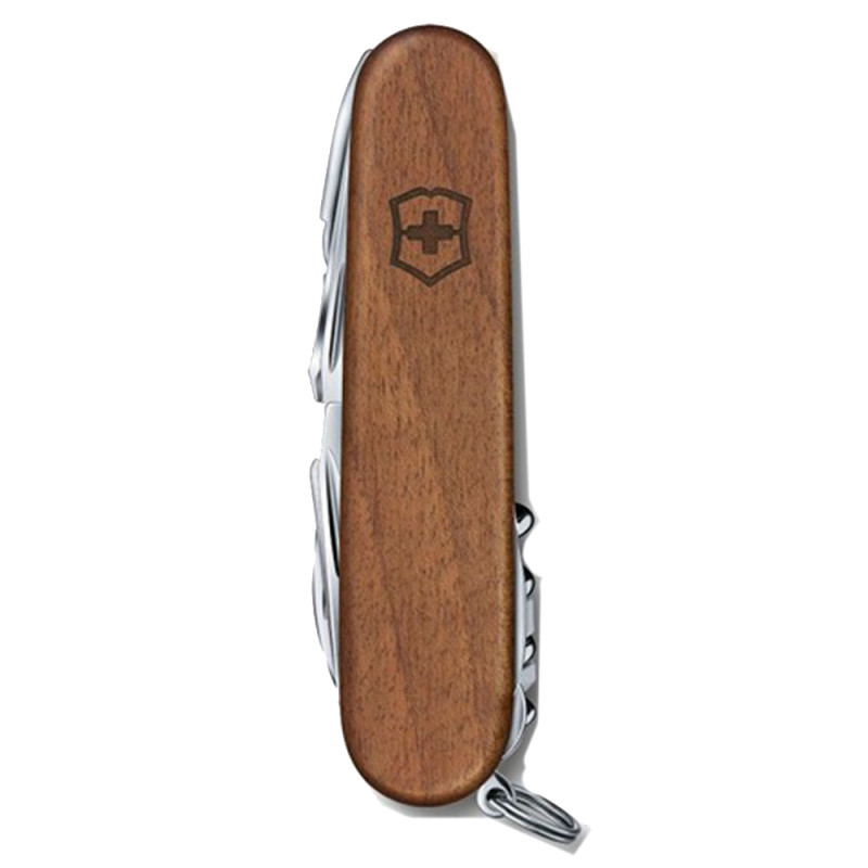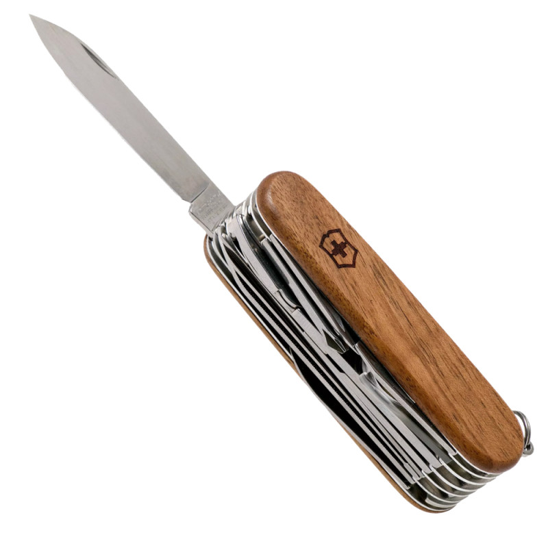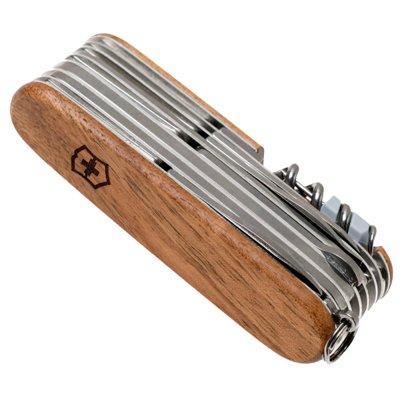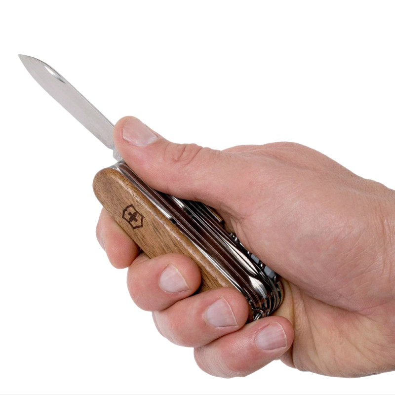 Багатофункціональний складаний швейцарський ніж Victorinox SwissChamp з дерев'яною рукояткою міститься в кишені, при цьому виконує 29 функції. За допомогою цього ножа можна впоратися практично з будь-якою роботою: перекусити провід або розібрати дрібні деталі під лупою. Всі інструменти ножа виготовлені з високоякісного матеріалу за найновішими технологіями та загартовані певним способом. Ніж містить набір інструментів і важить всього 185 гр.